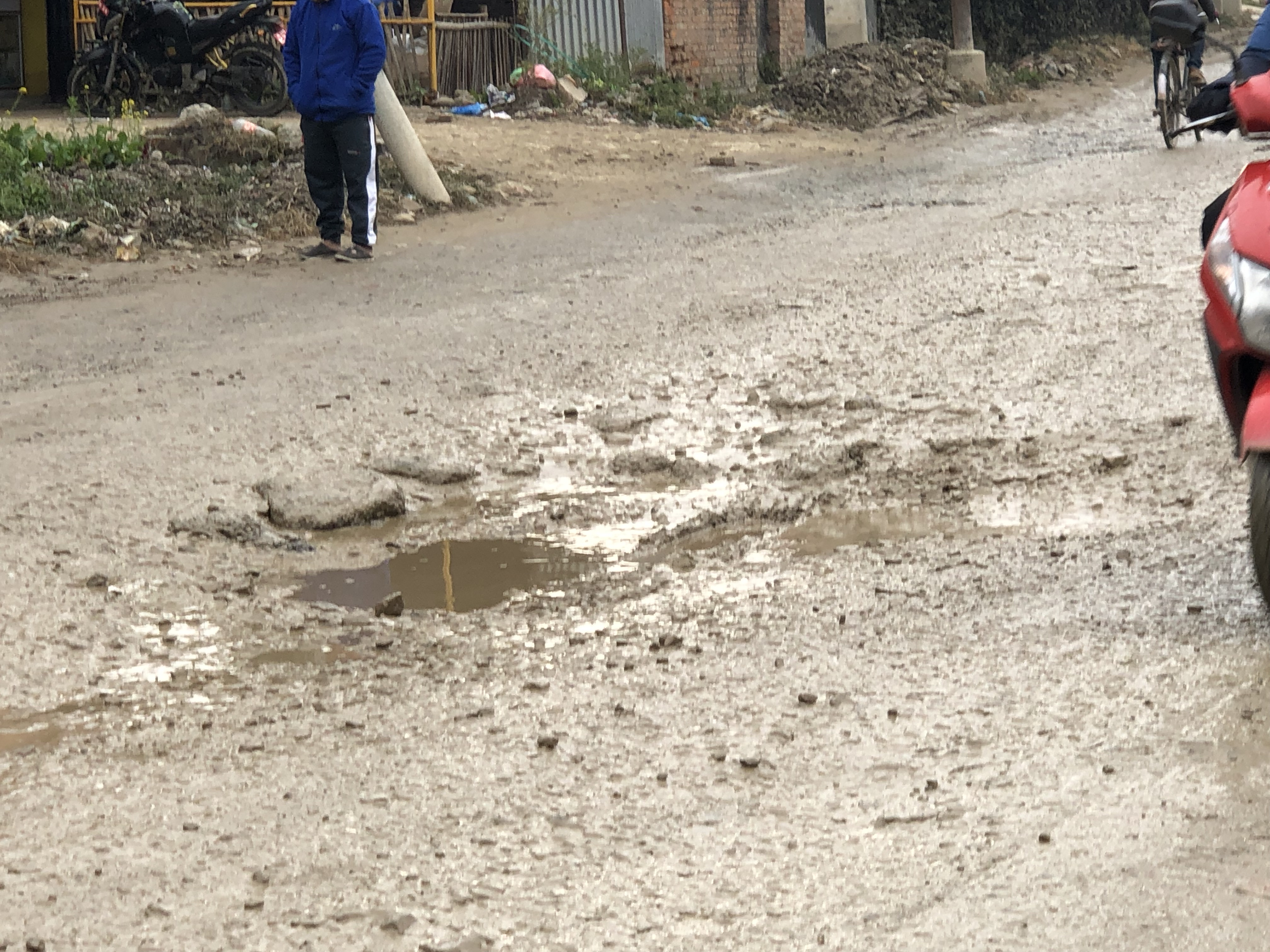 मजस्ता स्कुटर चलाउनेहरू यो बाटो भएर सहर जाँदा कति लड्यौं, त्यसको लेखाजोखा छैन। म यहाँ बस्न थालेको केही महिनामा दुई-चार जनाले ज्यान गुमाइसके। मान्छे नलडेको दिनै हुँदैन। ठूलो गाडीले हिलो छ्यापेको निहुँमा दिनहुँजसो झगडा भइरहन्छ।