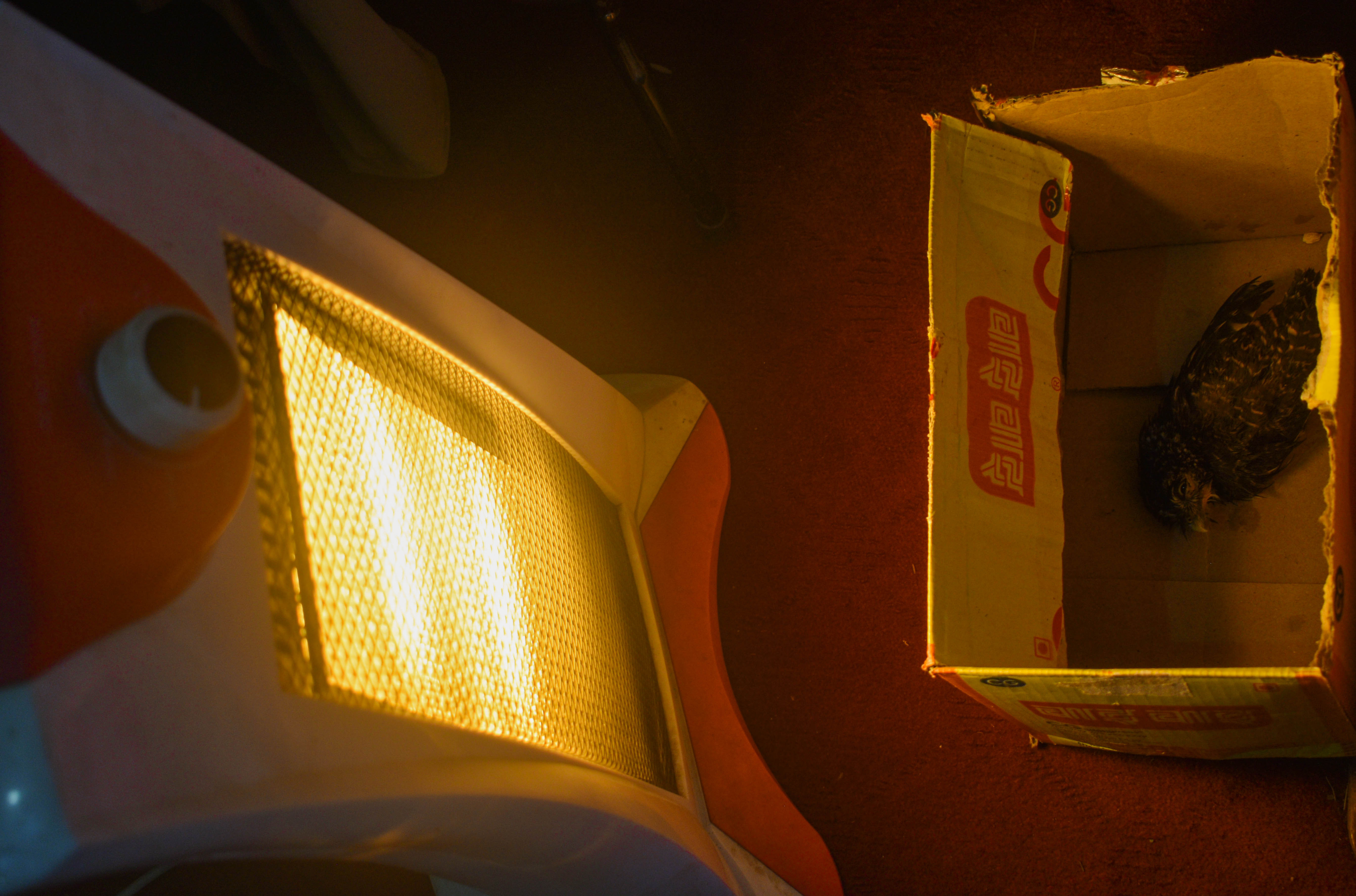 झरीले निथ्रुकै भिजेको, उढ्न नसक्ने उल्लुको बच्चा, कुनै साहारा बिना यत्तिकै दिनभर छाड्दा खतरामा पर्छ कि भन्ने लाग्यो। धारा नजिकैको शंकरको घरबाट वाइवाई चाउचाउको कार्टुन ल्याउन लगाएँ। उल्लुलाई सुरक्षित कार्टुन भित्र राखेँ र आफ्नो घर लिएर गएँ।