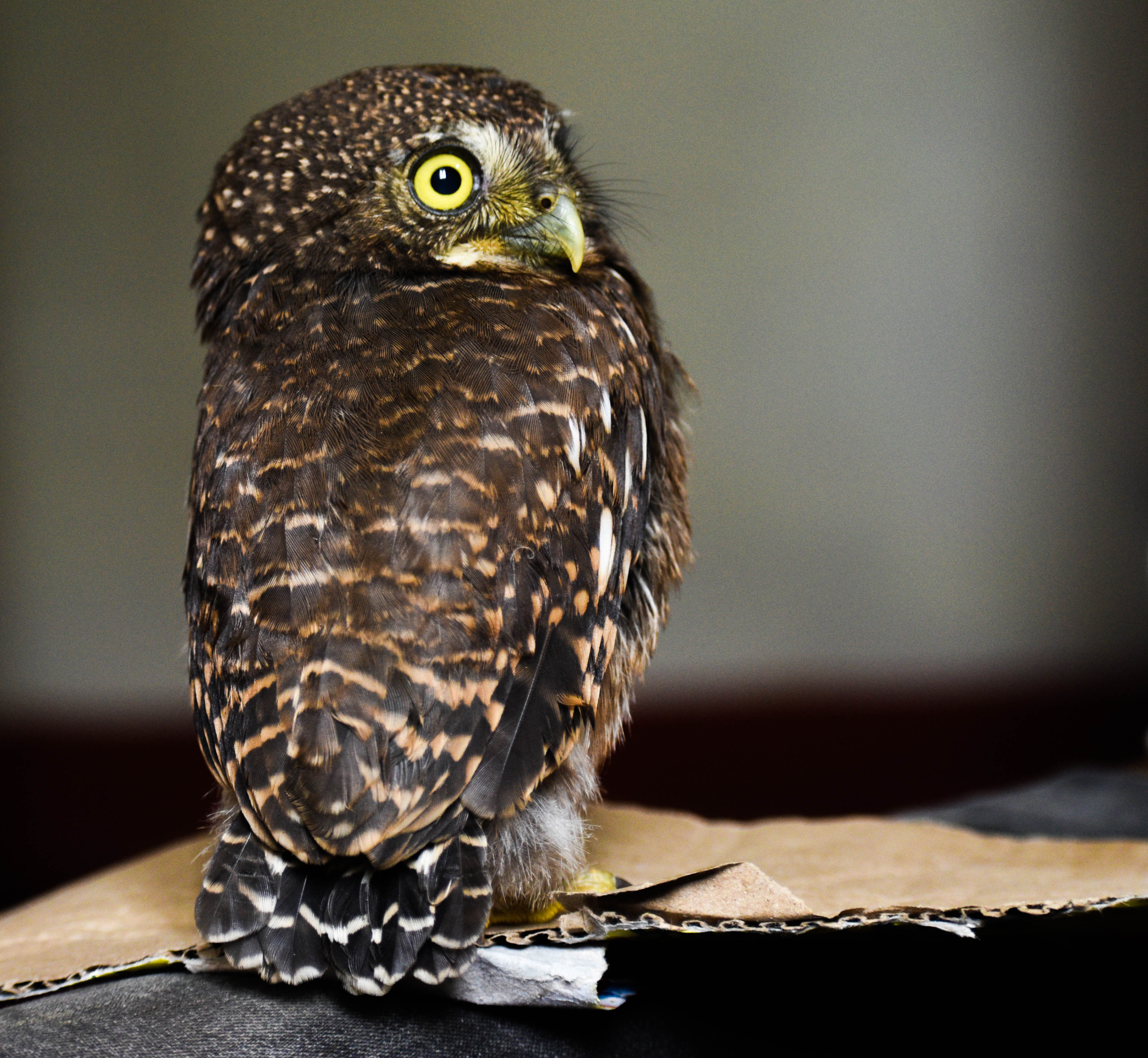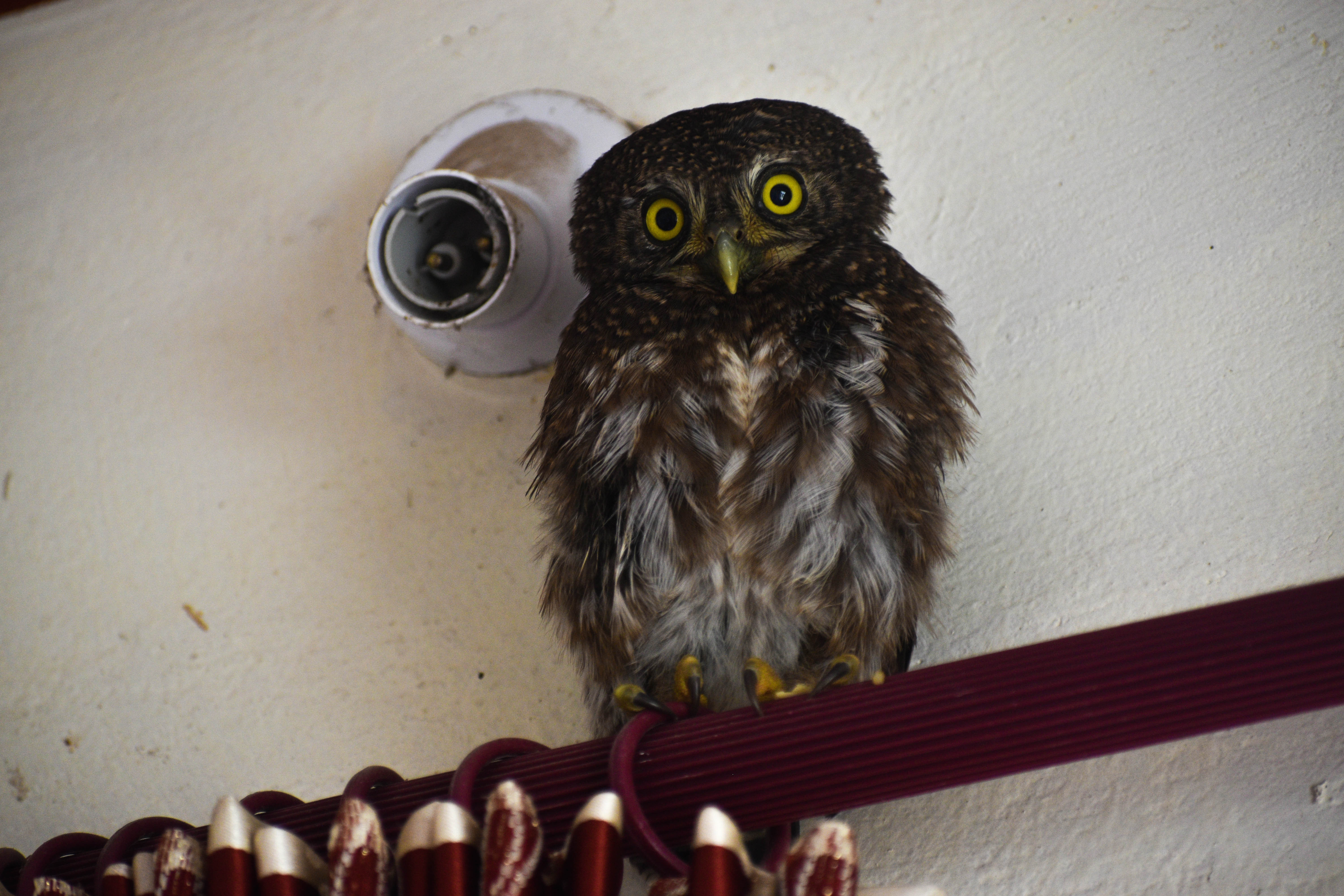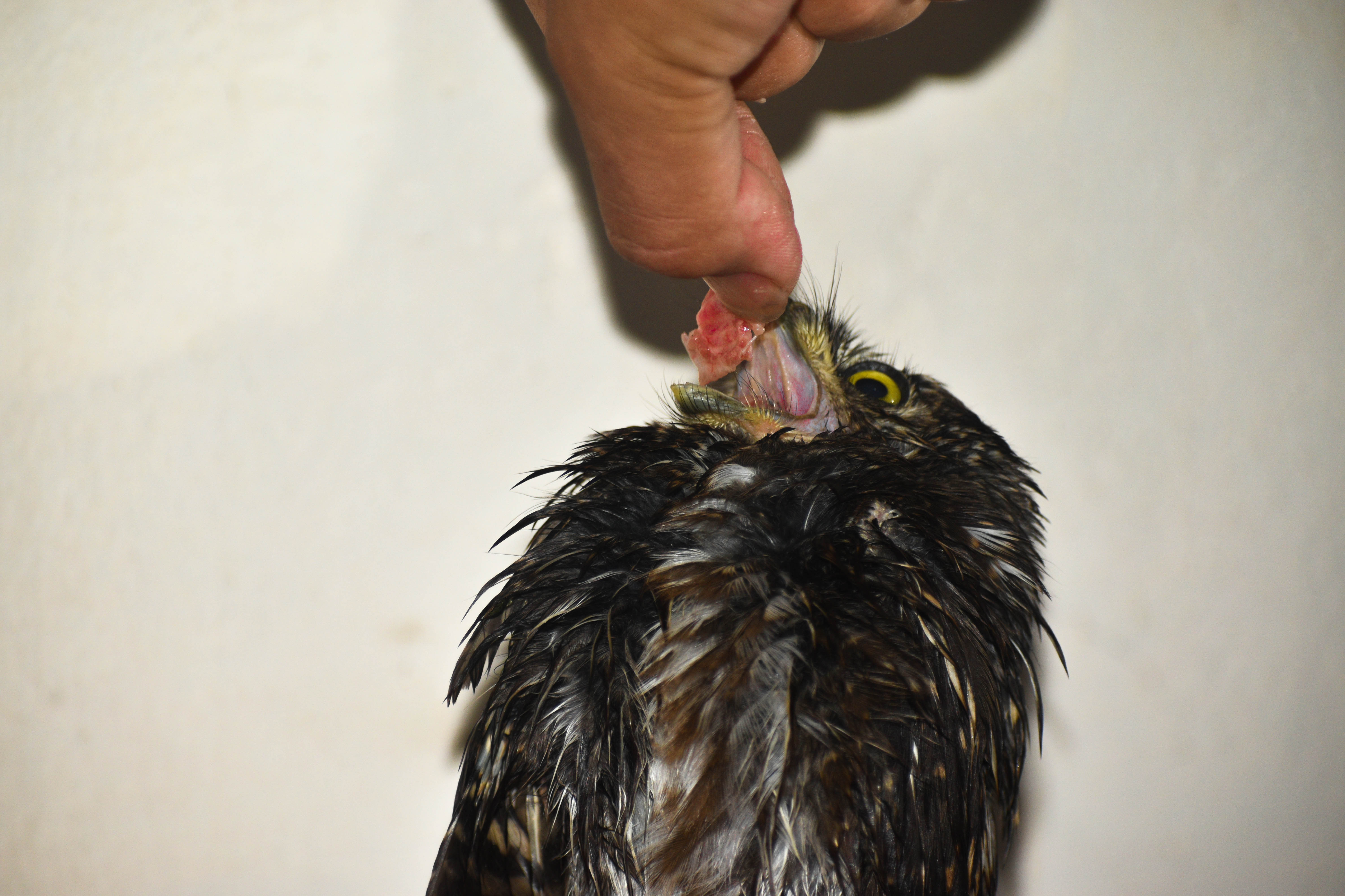 घर पुगेर केही मिनेट इलेक्ट्रिक हिटरको तापमा राखे पछि उल्लु टाठो भइ कोठा भित्र केही हल्का हिड्डुल गर्न थाल्यो। पानी र कुखुराको मासु, सानो टुक्रा गरेर खुवाएपछि उल्लु झनै सक्रिय भइ २ मिटर माथि पर्दाको डण्डीमा गएर रुखमा झैँ बस्यो।