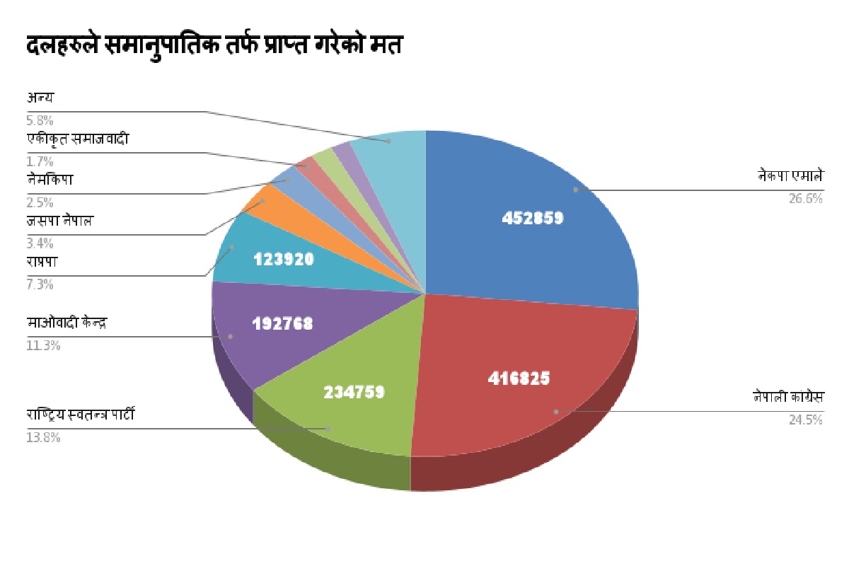 यी बाहेक अन्य दलहरुले ३ प्रतिशत मत प्राप्त गर्न सकेका छैनन्। प्रतिनिधि सभाको समानुपातिक तर्फको ११० सिटको बाँडफाँडका लागि दलहरुले ३ प्रतिशत थ्रेसहोल्ड कटाउनुपर्छ।