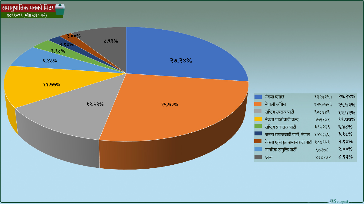 यस्तै राष्ट्रिय स्वतन्त्र पार्टीले ६ लाख ८ हजार ४४६ मतसहित तेस्रो स्थानमा छ।