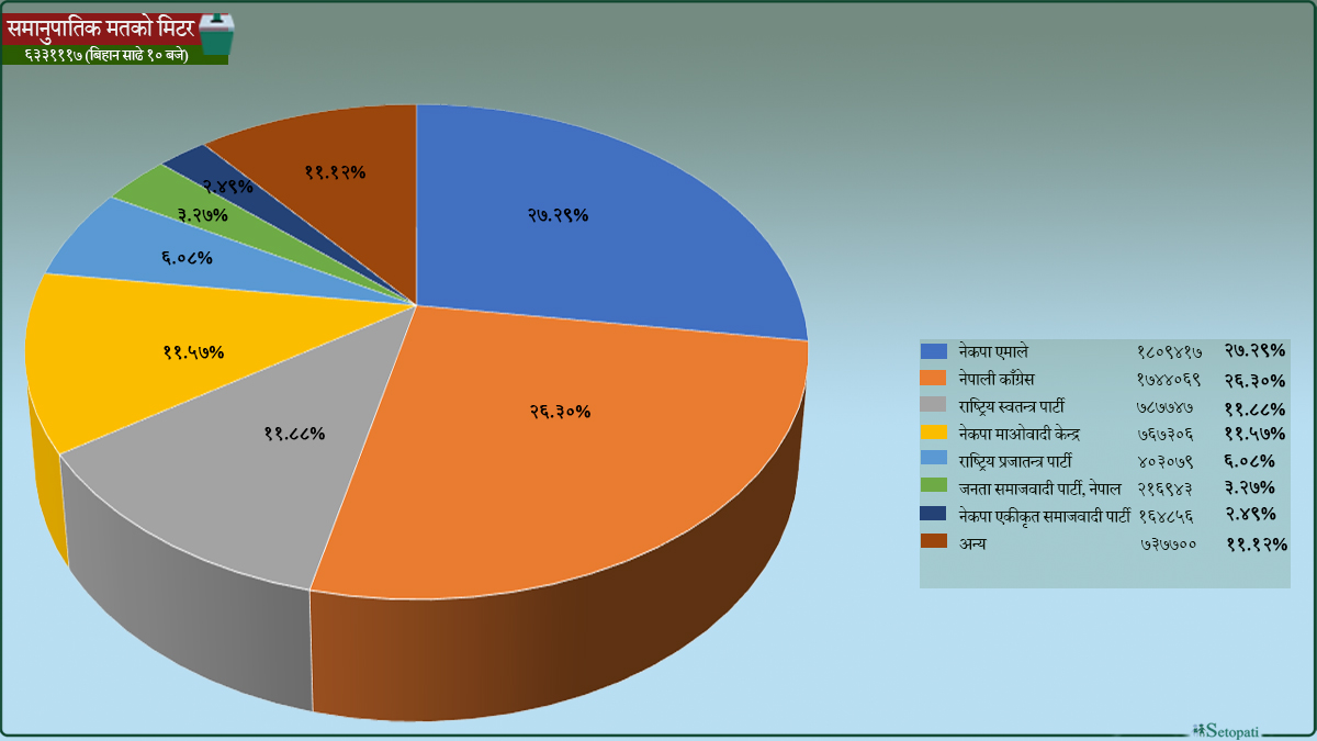 समानुपातिक निर्वाचन प्रणालीतर्फ भने एमाले पहिलो र कांग्रेस दोस्रो स्थानमा छन्। बिहान साढे १० बजेसम्म एमालेले सबैभन्दा बढी १८ लाख मत कटाएको छ।