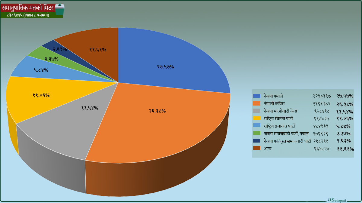 निर्वाचन आयोगको बिहान ८ बजेको तथ्याङ्क अनुसार एमालेले २२ लाख ९० हजार ३९७ मत प्राप्त गरेको छ। कांग्रेसले २१ लाख ९१ हजार ३८२ मत पाएर दोस्रो स्थानमा छ ।