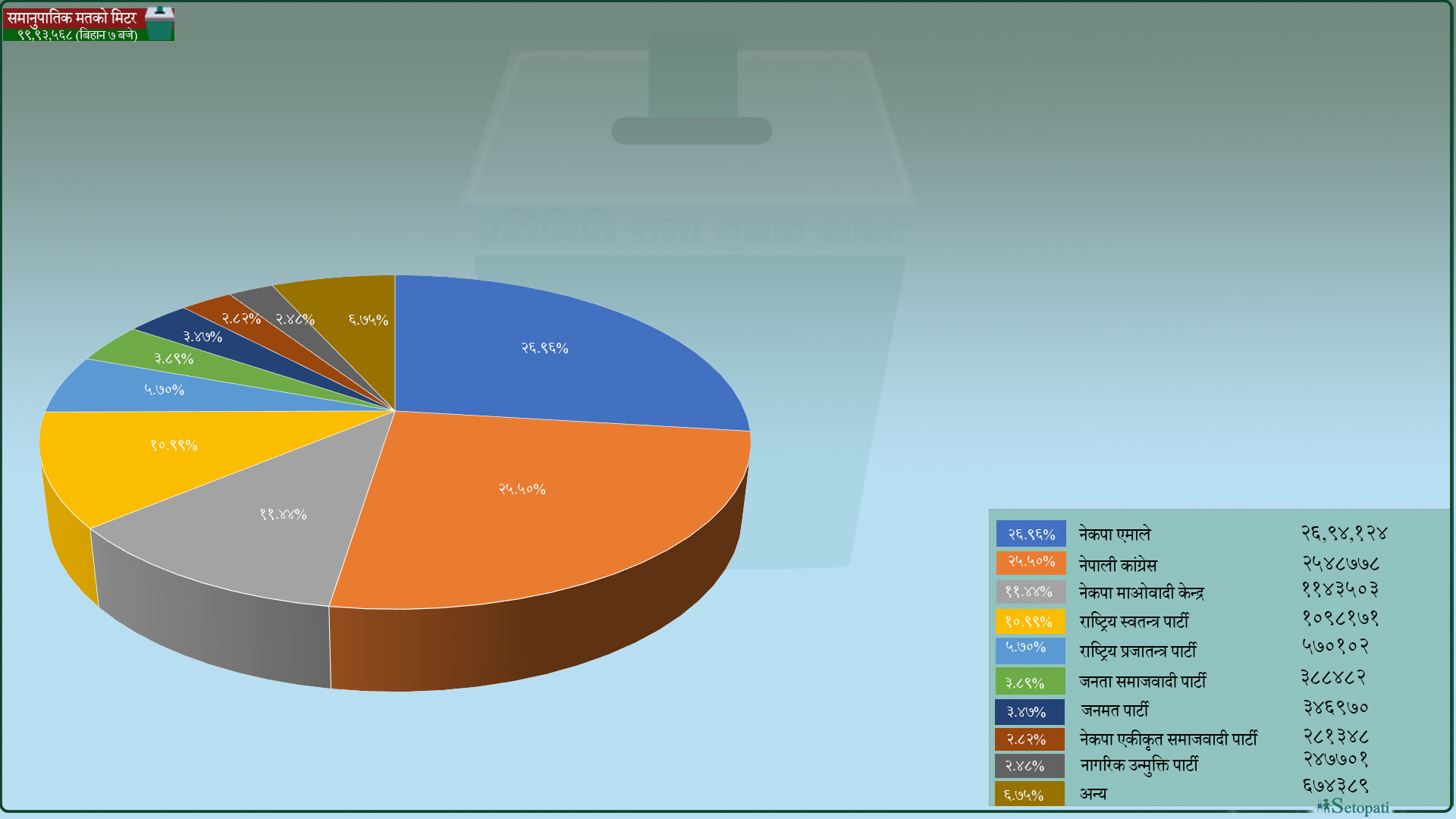 यस्तै प्रतिनिधि सभाको समानुपातिकतर्फ कुल ९९ लाख ९३ हजार ५६८ मत गणना हुँदा नेकपा एमालेको अग्रता कायमै छ।
