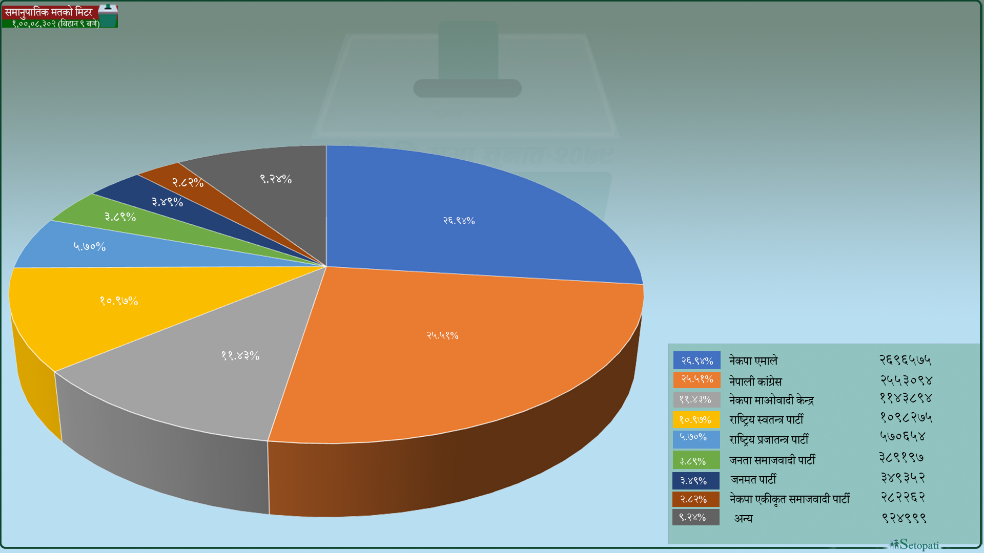 यस्तै प्रतिनिधि सभाको समानुपातिकतर्फ कुल १ करोड ८ हजार ३०२ मत गणना हुँदा नेकपा एमालेको अग्रता कायमै छ।