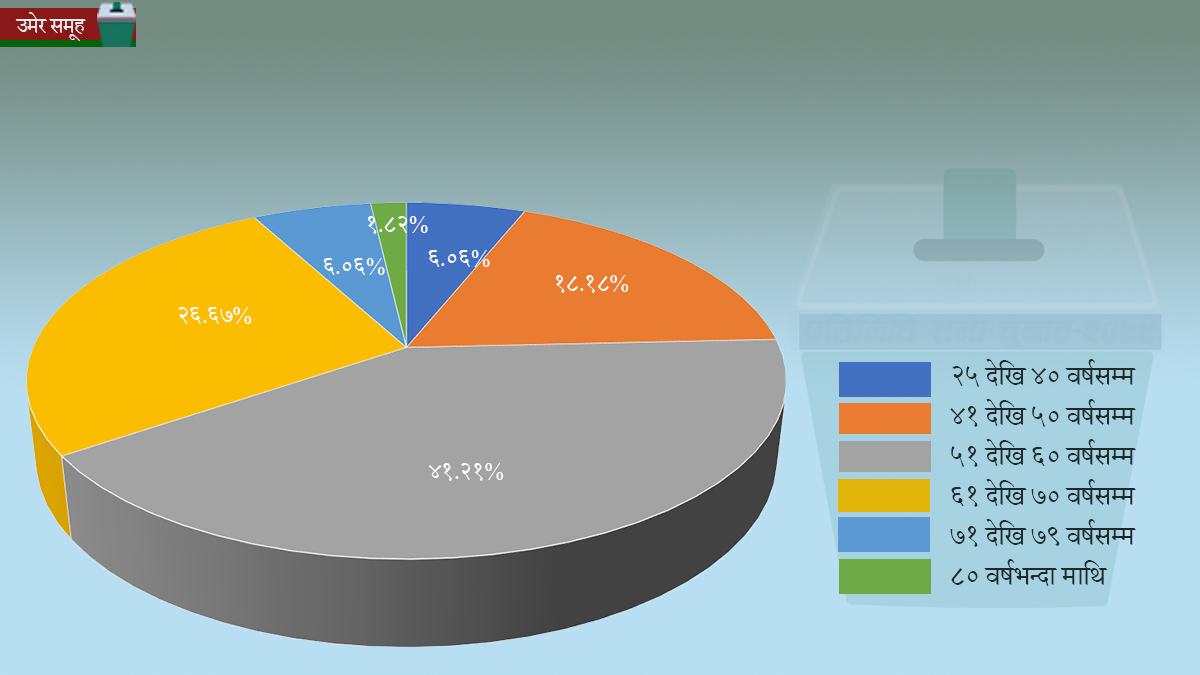 हालै सम्पन्न प्रतिनिधि सभा सदस्य निर्वाचनमा प्रत्यक्षबाट निर्वाचित १६५ जना सांसदमध्ये अधिकांश ५१ देखि ६० वर्ष उमेर समूहका निर्वाचित भएका छन्।