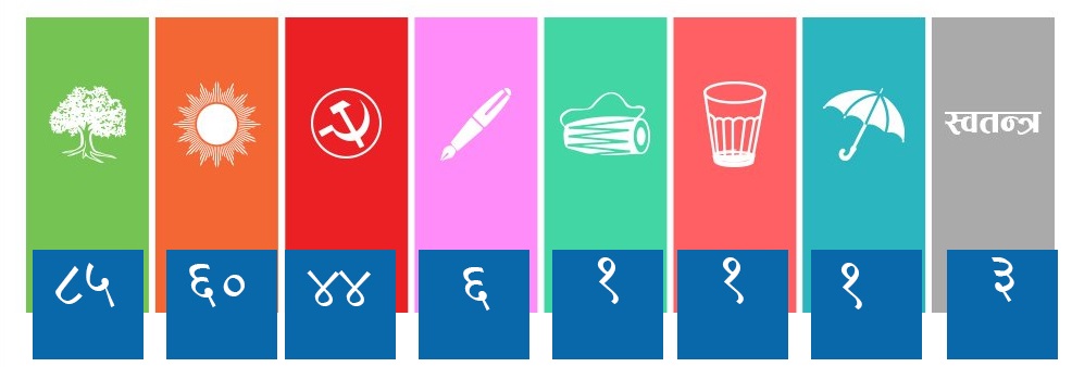 कांग्रेसले हालसम्म ८५ पालिका जितेको छ। ६० पालिकामा नेकपा एमालेले जितेको छ।