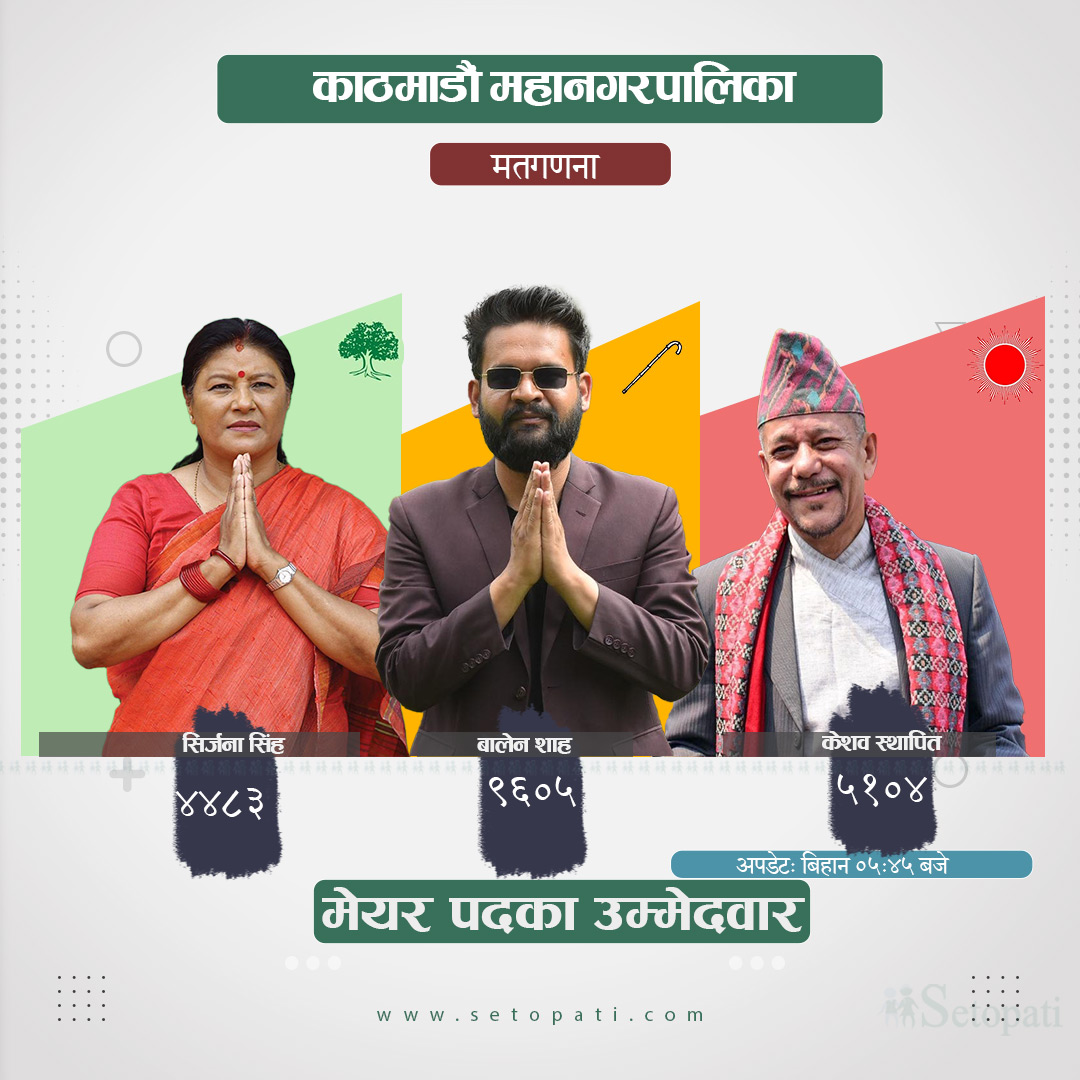 काठमाडौं महानगरपालिकाको मेयरमा स्वतन्त्र उम्मेदवार बालेन साहले अग्रता कायमै राखेका छन्। पछिल्लो मतगणनाको परिणाम अनुसार शाहले ९ हजार ६ सय ५ मत पाएका थिए।