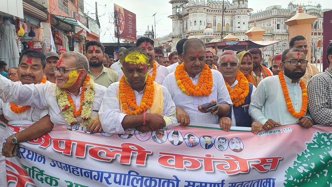 ‘घण्टाघर’ चिन्ह लिएर चुनाव लडेका उनको र्यालीमा कांग्रेसका नेता कार्यकर्तासँगै पार्टीको झण्डा लिएर जयजयकार गरेका थिए।
