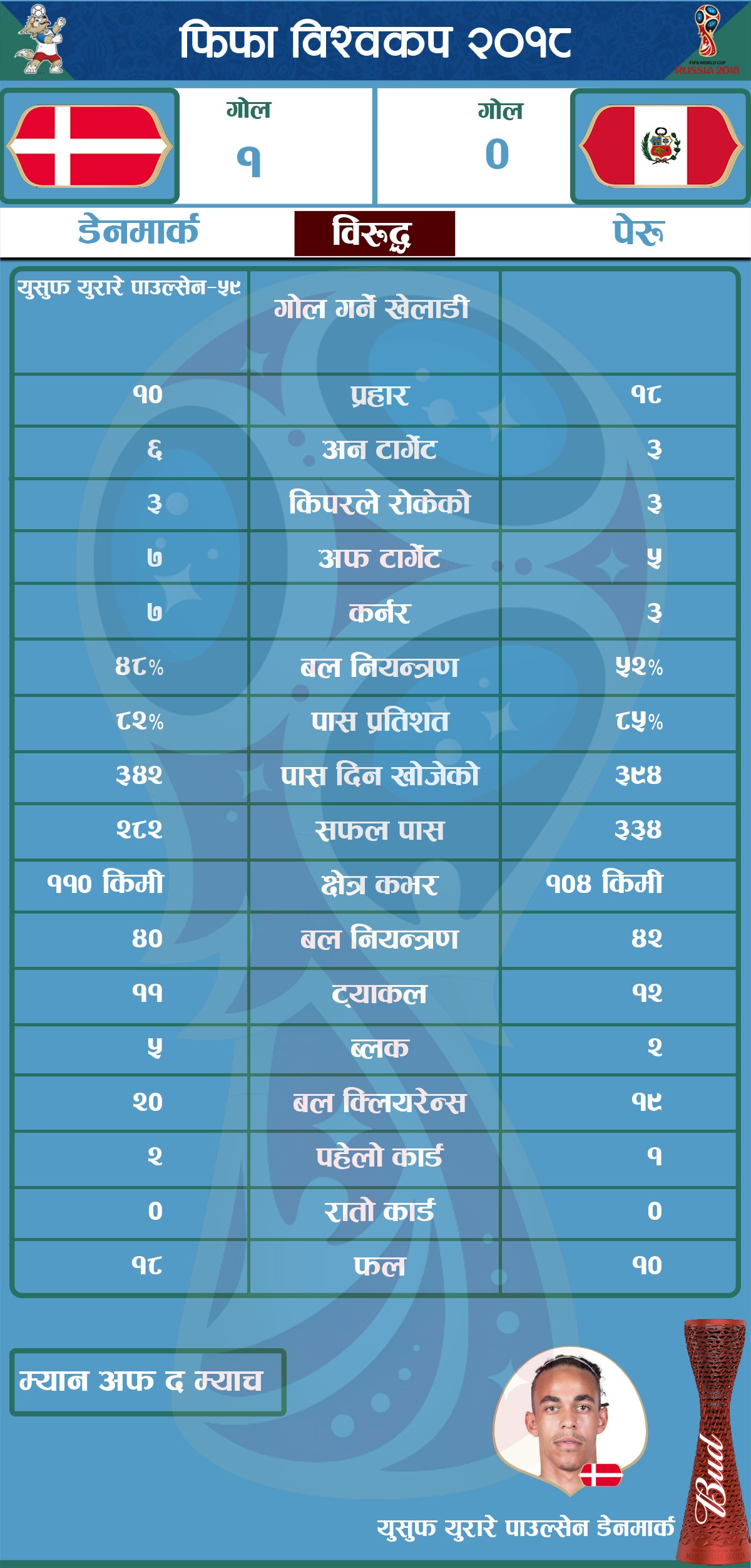 विश्वकपमा शनिबार भएको खेलमा पेरू डेनमार्कसँग पराजित भएको छ। खेलमा डेनमार्कका लागि युसुफ पउलसेनले ५९ औँ मिनेटमा गोल गर्दै डेनमार्कलाई १-० को अग्रता दिलाएका थिए। उनले गरेको उक्त गोल नै निर्णायक भएको हो। युसुफले कान्टर एट्याकमा गोल गरेका थिए।