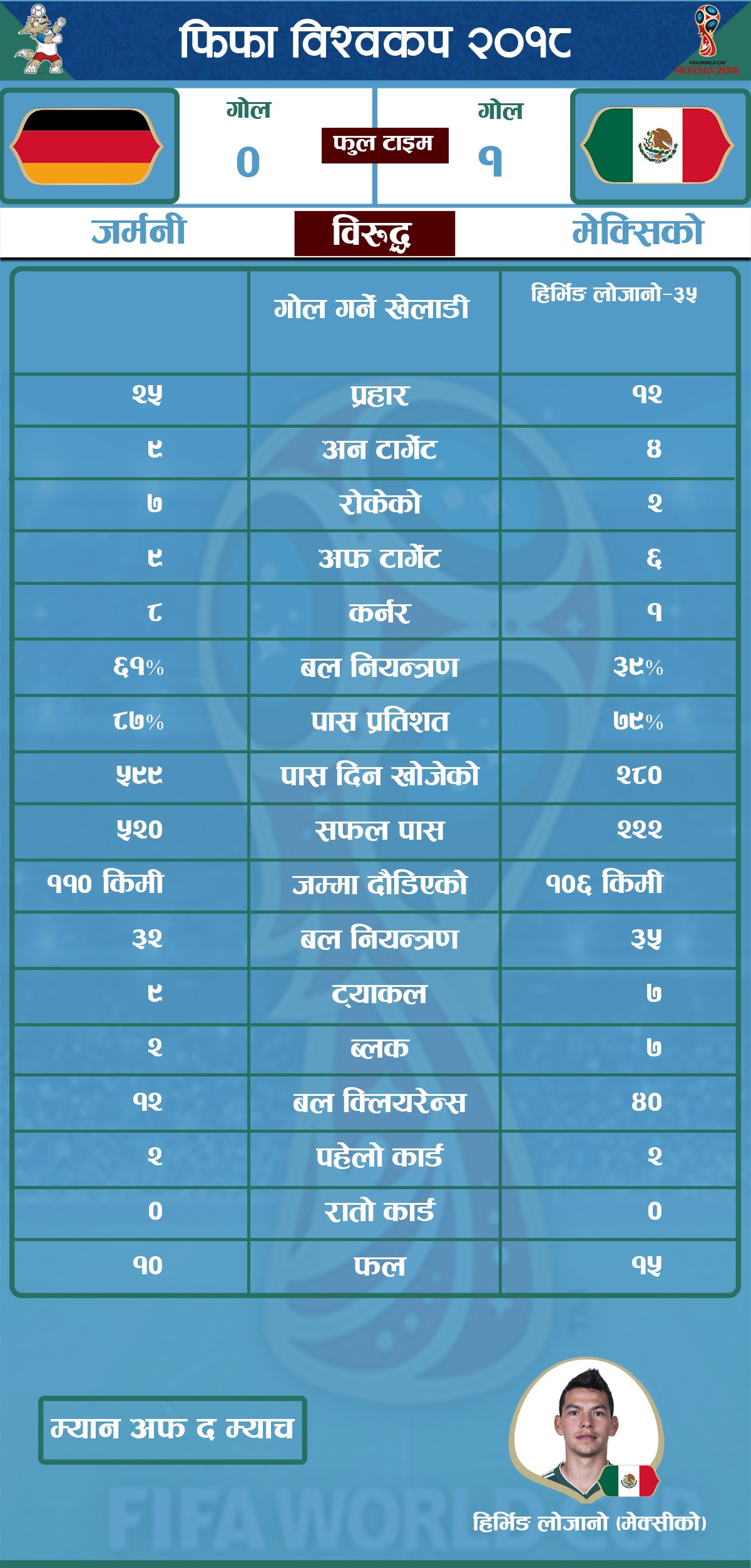६१ प्रतिशत बल नियन्त्रणमा लिएको जर्मनीले २५ पटक प्रहार गरेको थियो। पोष्टमा प्रहार ९ बल मेक्सिको किपरले बिफल बनाएका थिए। ३९ प्रतिशत बल नियन्त्रणमा लिएको मेक्सिकोले मात्र १२ पटक प्रहार गरेको थियो।
