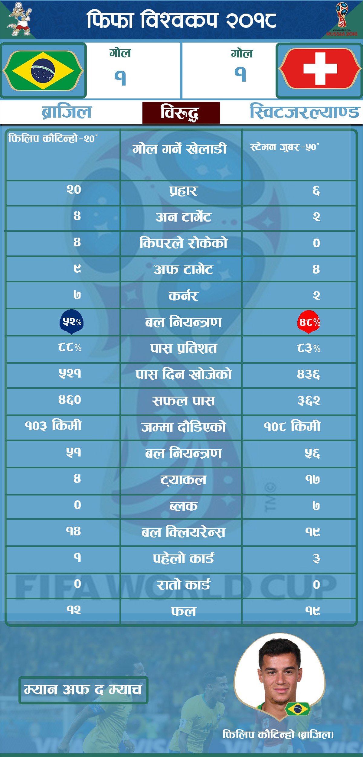 मस्कोस्थित रोस्तोभ अन डोनमा भएको खेलमा ब्राजिल स्वीट्जरल्याण्डसँग १-१ गोलको बराबरीमा रोकिँदै अंक बाढ्न बाध्य भएको हो।