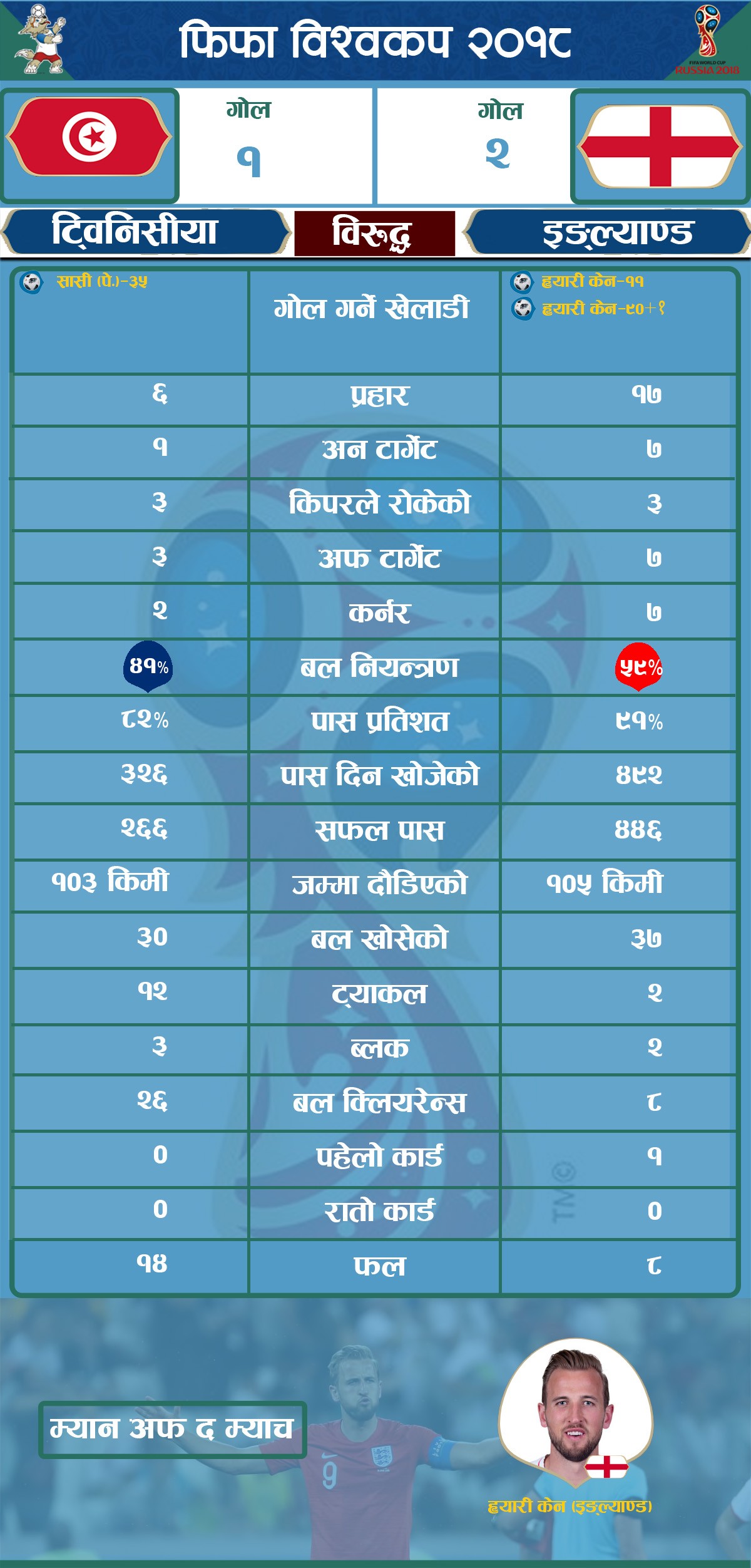 भोल्बोग्राड स्टेडियममा भएको खेलमा इंग्ल्यान्डलाई जिताउन दुवै गोल कप्तान ह्यारी केनले गरे। ट्युनिसियाका लागि फेर्जानी ससीले एक गोल फर्काएका थिए।