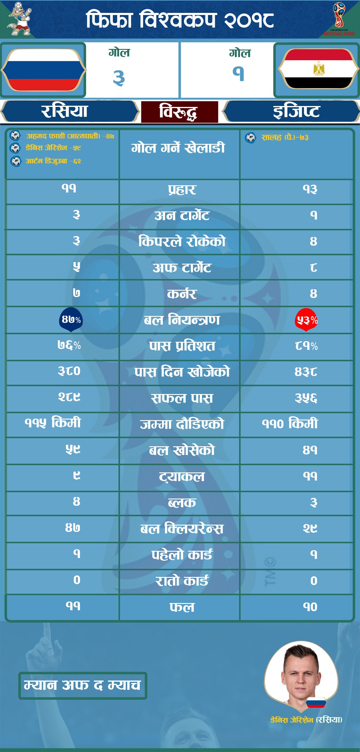 खेलको ५९ औं मिनेटमा डेनिस चेरिसेभले गोल गर्दै रसियाको अग्रता दोब्बर पारे।