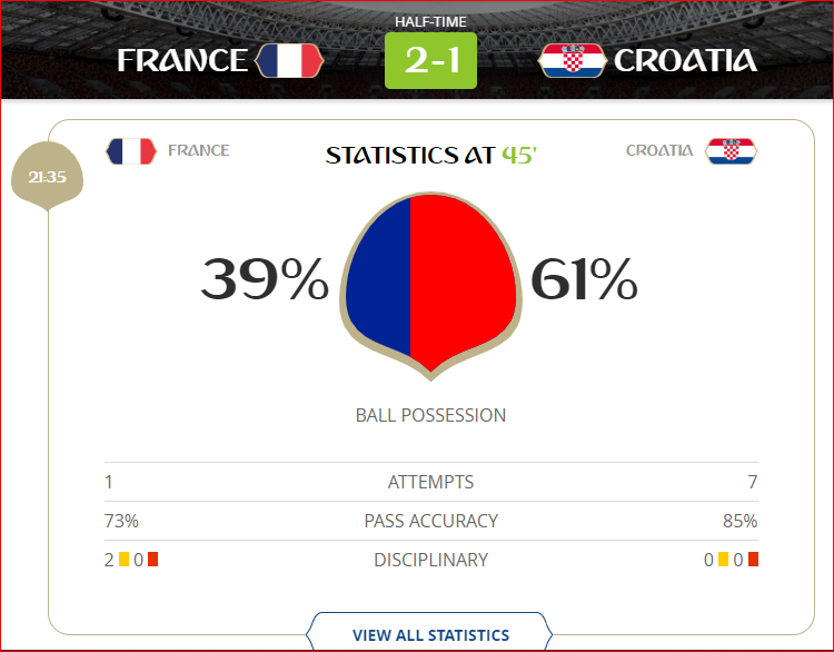 पहिलो पटक विश्वकप फाइनल खेलिरहेको क्रोएसियाले अधिकांश समय फ्रान्सलाई दबाबमा राख्यो। पहिलो हाफसम्म ७ पटक पोष्टमा प्रहार गरेको थियो। जसमध्ये एउटा अनटार्गेट थियो भने ३ वटा अफ टार्गेट र ३ वटा प्रहार किपरले रोकेका थिए।