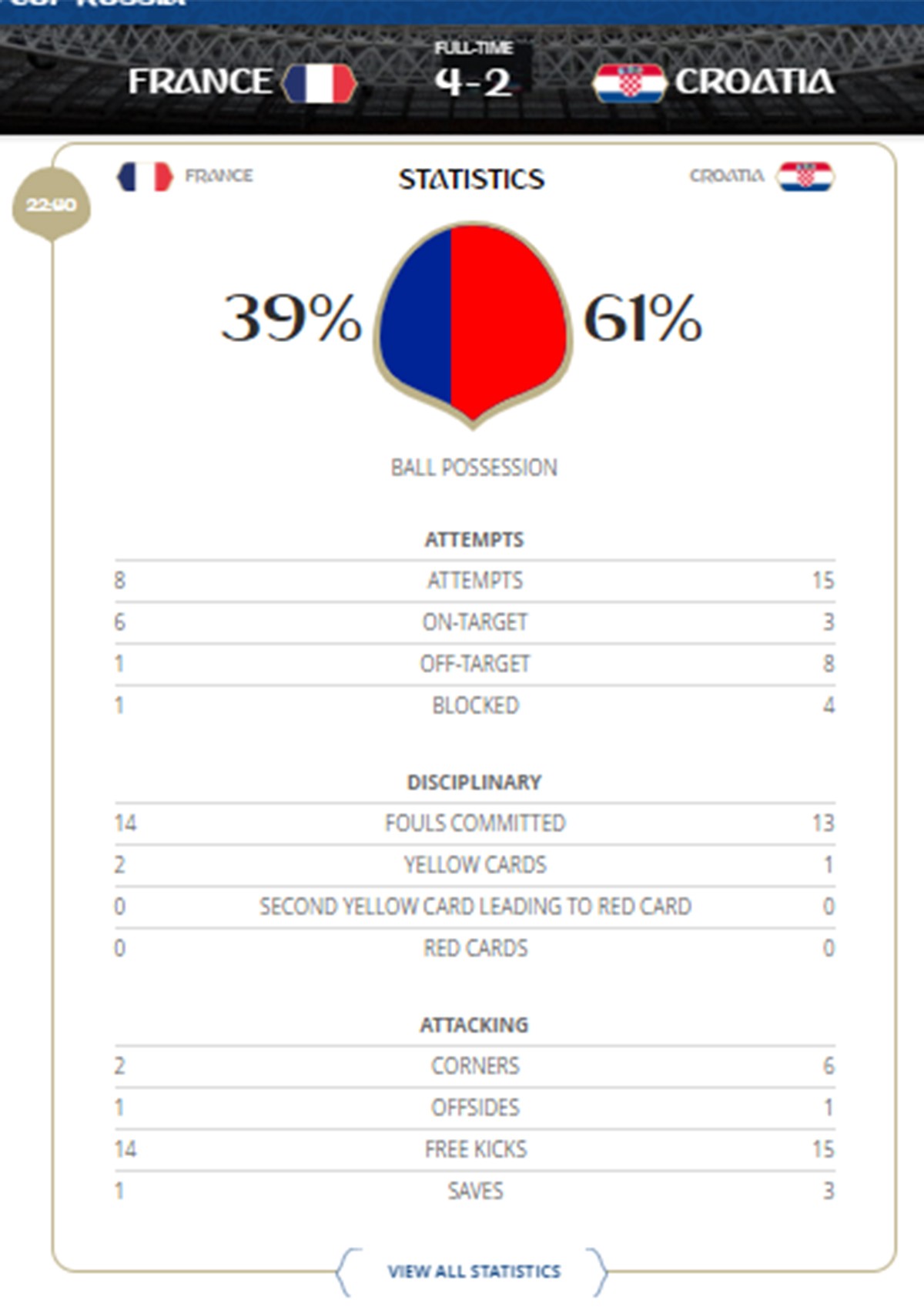 यदी आज क्रोएसियाले खेल जितेको भए विश्वकप जित्ने नवौं राष्ट्र बन्ने थियो। मात्र ४३ लाख जनसंख्या र रूसी सहर मस्कोभन्दा एक तिहाई आकारको क्रोएसिया विश्वकप जित्ने उरुग्वेपछिको दोस्रो सानो राष्ट्र बन्ने थियो। तर आज राम्रो खेल्दा खेल्दै उसले हार व्यहोर्न बाध्य भयो। अधिकांश समय ल नियन्त्रणमा राखेको क्रोएसियाले फिनिसिङ गर्न नसक्दा हार्नुपर्यो। फ्रान्सले पाएका थोरै अवसरलाई उत्कृष्ट सदुपयोग गर्दै खेल जित्यो।