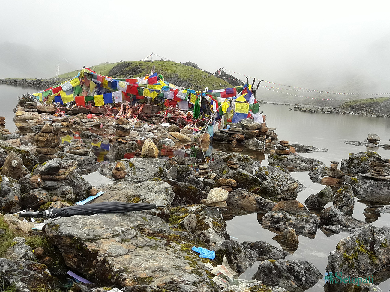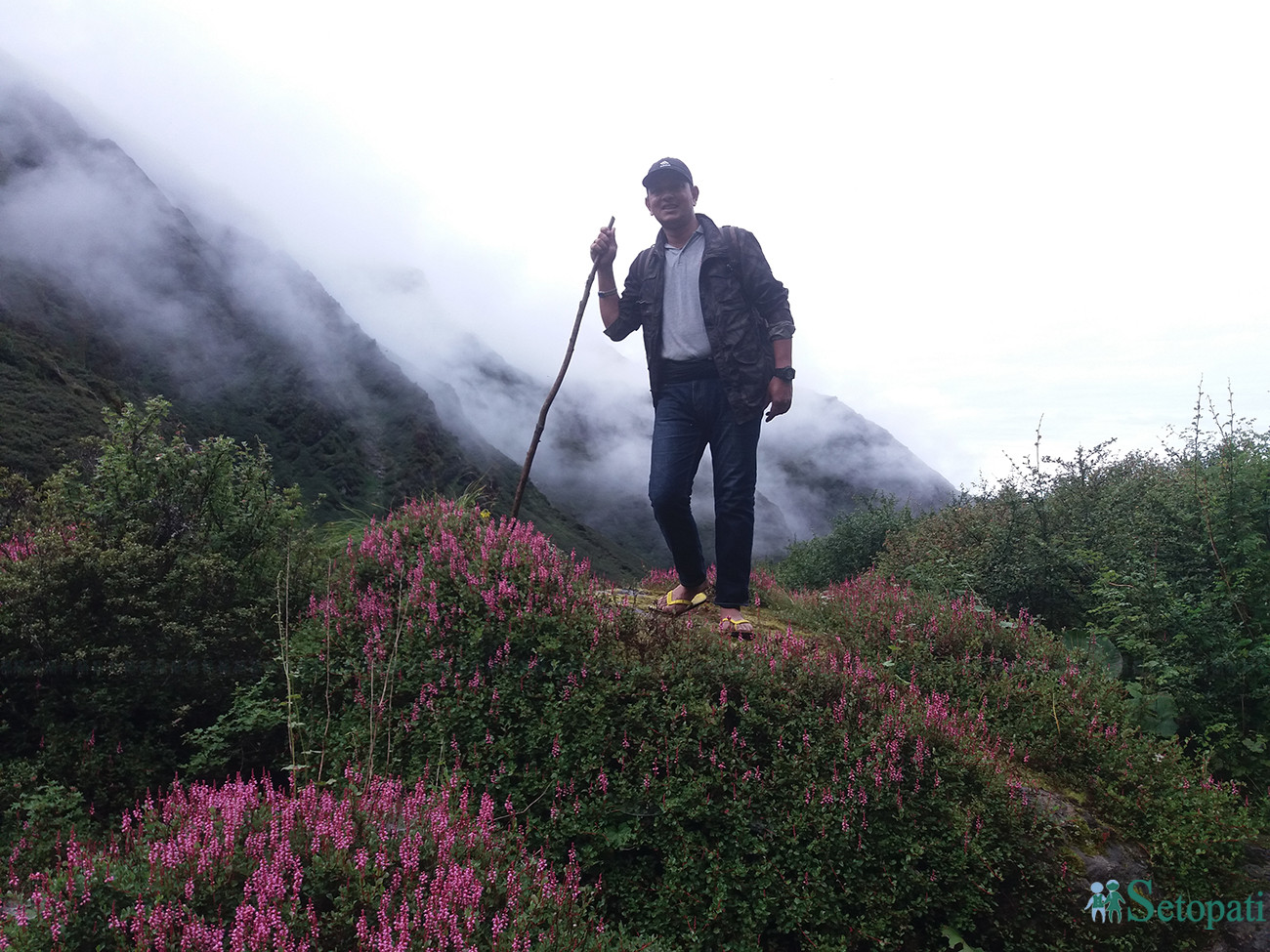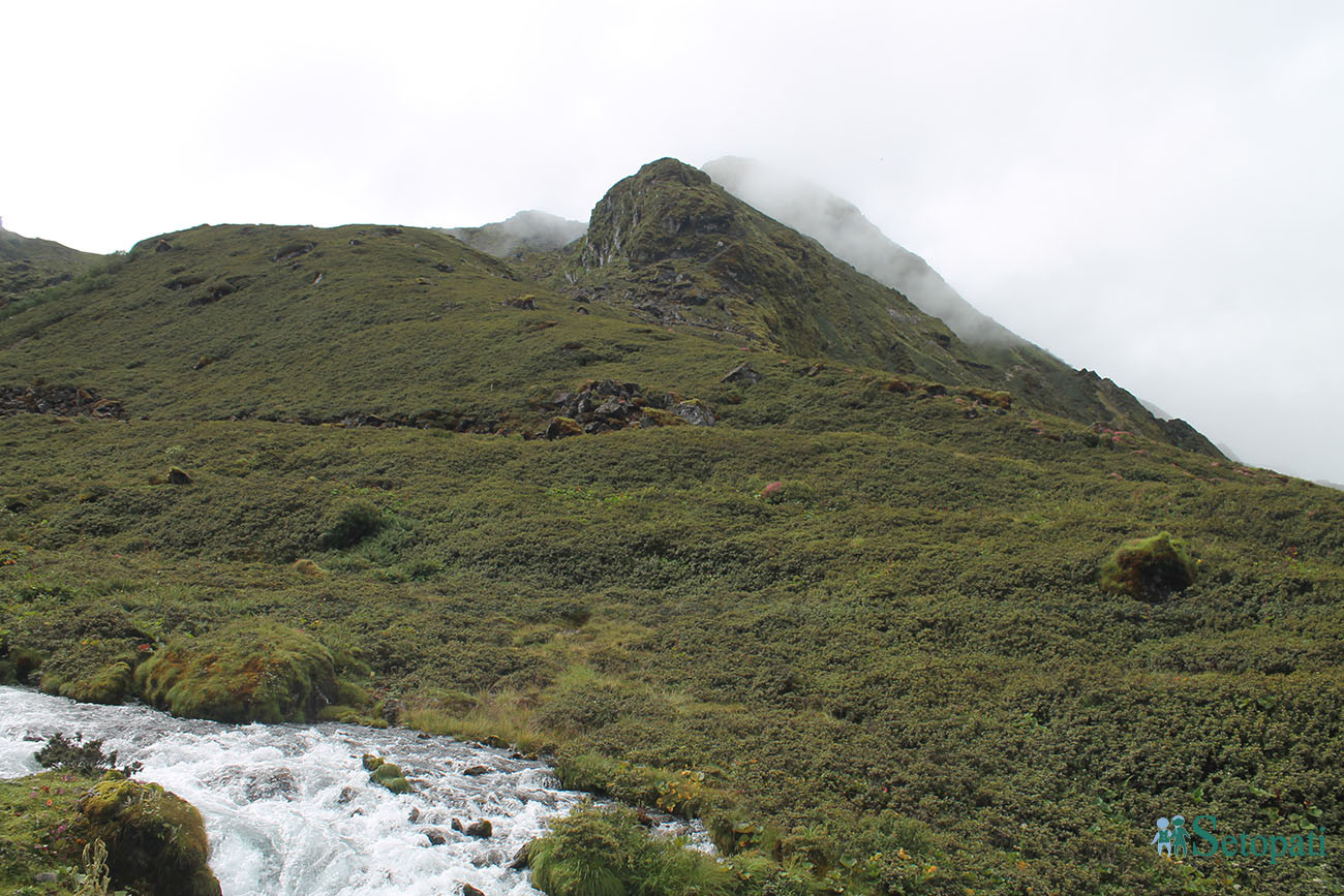 यात्राकै क्रममा दोलखाका तीनजना यात्री भैटिए। उनीहरु एकै उमेर समूहका थिए। हामीभन्दा अगाडि हिँडेका तीनै जना बिच बाटोमा एक जना मात्र भेटिए। उनले झोला भिरेका थिए। झरीले निथुक्र भिजेका थिए। न उनले छाता ओढेका थिए न त प्लाष्टिक नै। उनी बिरामी परेछन भन्ने लागेर चउरमा पल्टिएका उनलाई पानी लगेर खान दिएँ। तर, खाने मुडमा रहेनछन्।