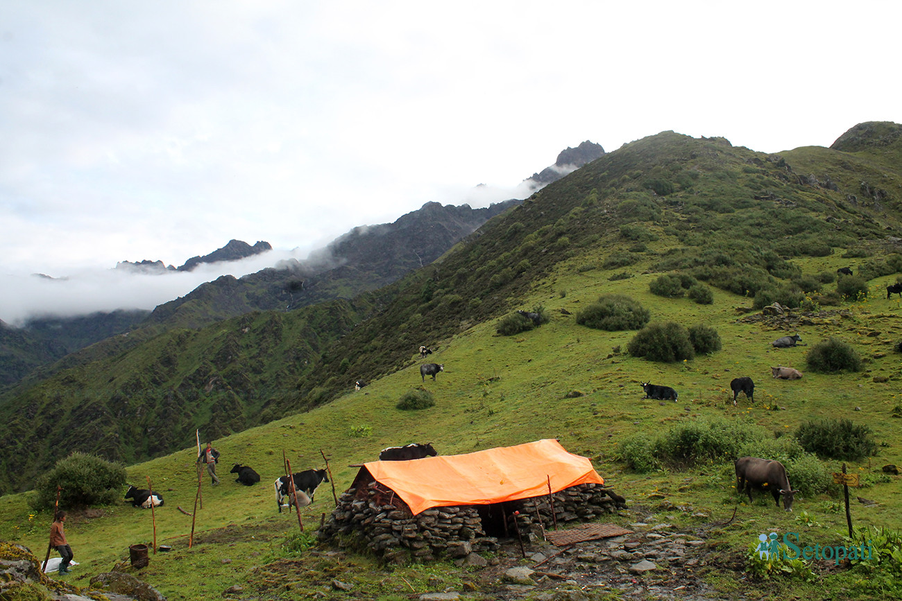 भूइँमा बिभिन्न फूलबुट्टा भरेर बिछ्याएको गलैँचा जस्तो फूलहरू फुलिरहेका थिए। झरी र जाडोलाई बेवास्ता गरी चरिरहेको चौँरीको दृष्य जति हेरे पनि आँखाहरु थाक्दैनन् थिए।