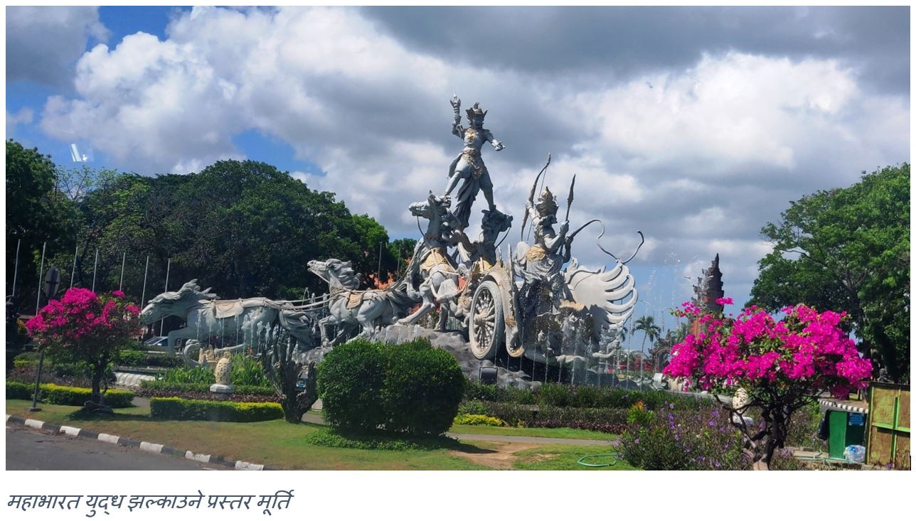 एयरपोर्टबाट होटल जाँदै गर्दा दुइटा कुरा याद गरेँ - हरेक जसो चौरस्ताका बीच भागमा रामायण र महाभारतका पात्रहरूको भीमकाय मूर्तिहरू विभिन्न भावभङ्गीमा उभिएका भेटिन्थे। अनि हरेक जसो घर, मन्दिर अगाडि विभिन्न रङका फूल, कागती, सुपारी आदि ताडको पातले बनेको साना टपरीमा राखिएका भेटिन्थे। वायानबाट थाहा पाएँ कि यिनलाई 'चनाङ सारी' भनिँदा रैछन् जो कि त्रिमूर्ति (ब्रम्हा, विष्णु, महेश्वर) लाई चढाइएका हुन्।