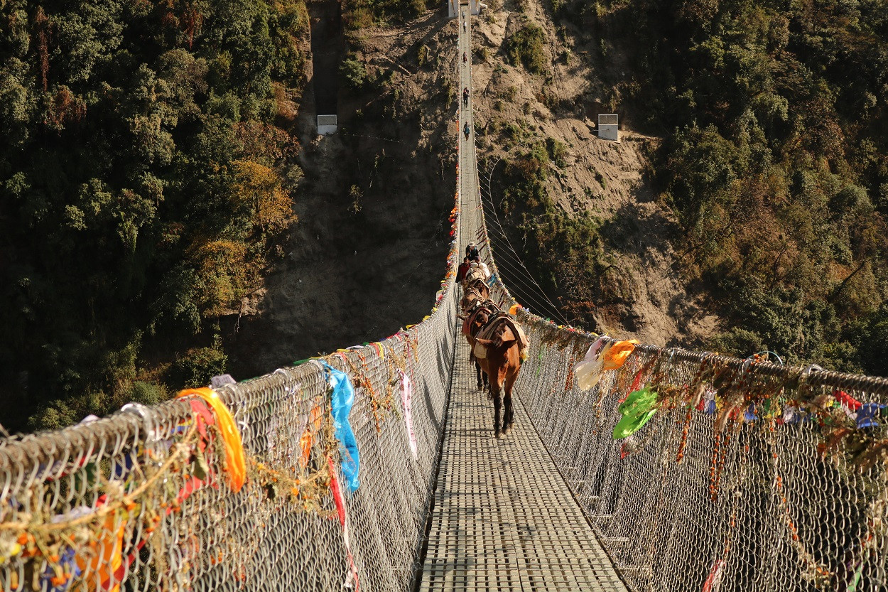 खच्चडको एक हुल आउँदा, राष्ट्रपतिको सवारीजस्तै हामी वारि नै बाटो छोडेर बस्यौ । उले मेरो हात तानेर बस्न भनिन्। ज्यान मेरो छातीमा अढेस लगाइन्। सिरानी मानेर। मेरो कमजोरी थाहा भएर, झोलुङ्गो पुल हल्लाउन उनी अगाडि गइन्। उनैले हल्लाएर हल्लिए जत्तिकै आत्मविश्वासका साथ मलाइ “डरपोक” भन्दै गिज्याइन्। झिंगुमा हामीले खाना खायौं। खाना खाइवरि उकालो चढ्यौं।