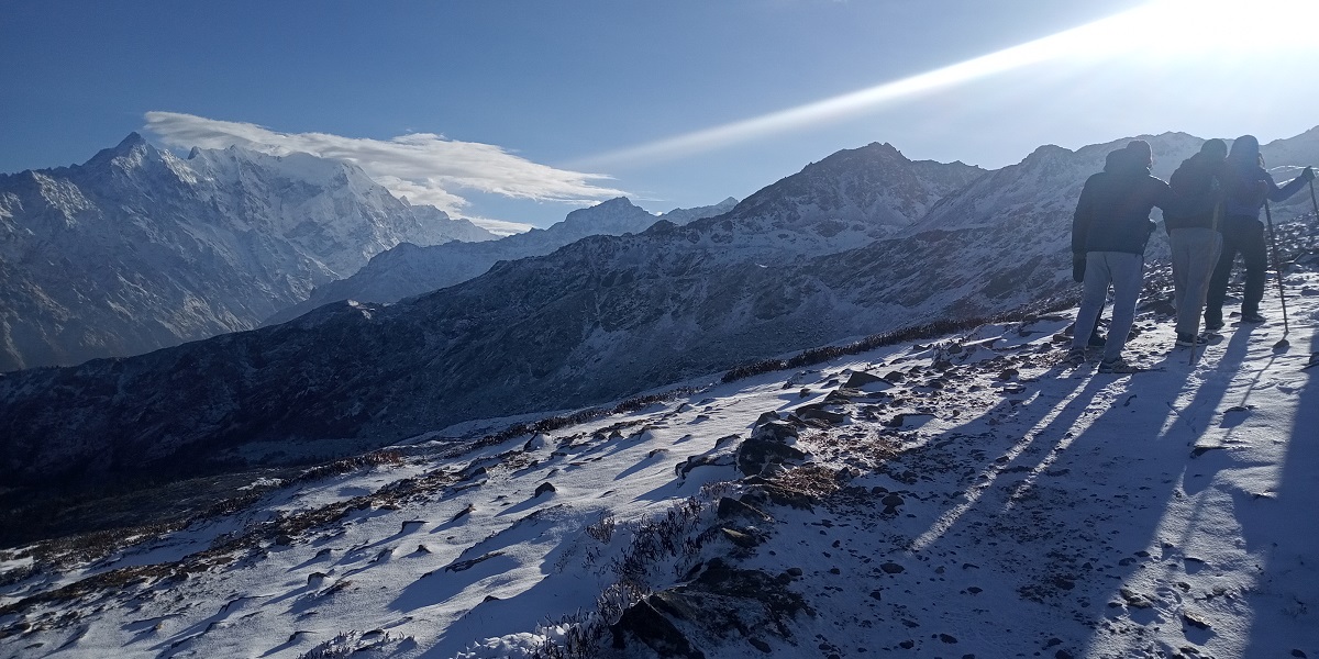 हाम्रो यात्रा सुनौलो झुल्के घामसँगै प्रारम्भ भयो। तीन तिरबाट उचालिएका चुचुराहरू हिउँले ढाकिँदा सधैंजसो चन्द्रमामा देखिने गरेको चाँदीको चमक आज आफ्नै धरातलमा छरपस्ट थियो। हामी यिनै दृश्यसहितको क्यामराभित्र कैद हुन थाल्यौं। हामीले माटो टेक्ने अवस्था थिएन। लाग्थ्यो, चाँदीको धरातलमा धर्तीले आत्मीयताको हात फिँजाइरहेको थियो।