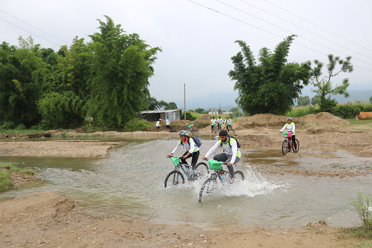 उनीहरुका लागि साईकल एउटा गतिलो अभ्यासको माध्यम बन्दै जान थालेको हो। बैबाङको आसपासमा स्थानीय खोला थुनेर माछा मारिरहेका थिए। हामी दामोदर मार्ग छोडेर पश्चिम नलागी उत्तरतर्फ लाग्नुपर्ने भयो। तर, हेमेन्द्र खड्का र बिमल पौडेल दामोदरमार्ग हुँदै पश्चिम तर्फ लागे। किनकि, उनीहरूले १०० किमी राईड गर्ने प्रण गरेका थिए।