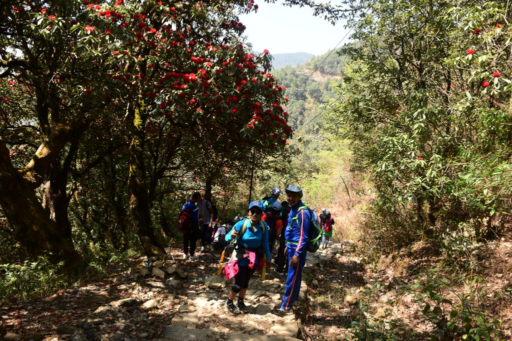 पदयात्रा सुरु गरेको केही समयपछि नै लालीगुराँसको वैंस मुस्कुराएको देख्न पाइयो। रुखमा राताम्मे थियो। यतिवेला काठमाडौंंलाई पहरा दिइरहेको जुनसुकै डाँडा चढे पनि गुराँस देख्न पाइन्छ।
