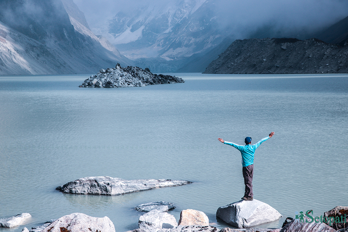 माथितिर हेर्दा नाङ्गो पाखा, अहिले नै पहिरिने हो कि जस्तो लाग्थ्यो। मनमा त्यहीँ डर बोकेर हिँडेको हामीलाई त्यो खोला वरपर पुग्दा एक किसिमको डर लागिरहेको थियो। डरैडरमा खोला पार गरेर ताल पुग्नलाई उकालो लाग्न थालेपछि डर केही हल्का भयो।