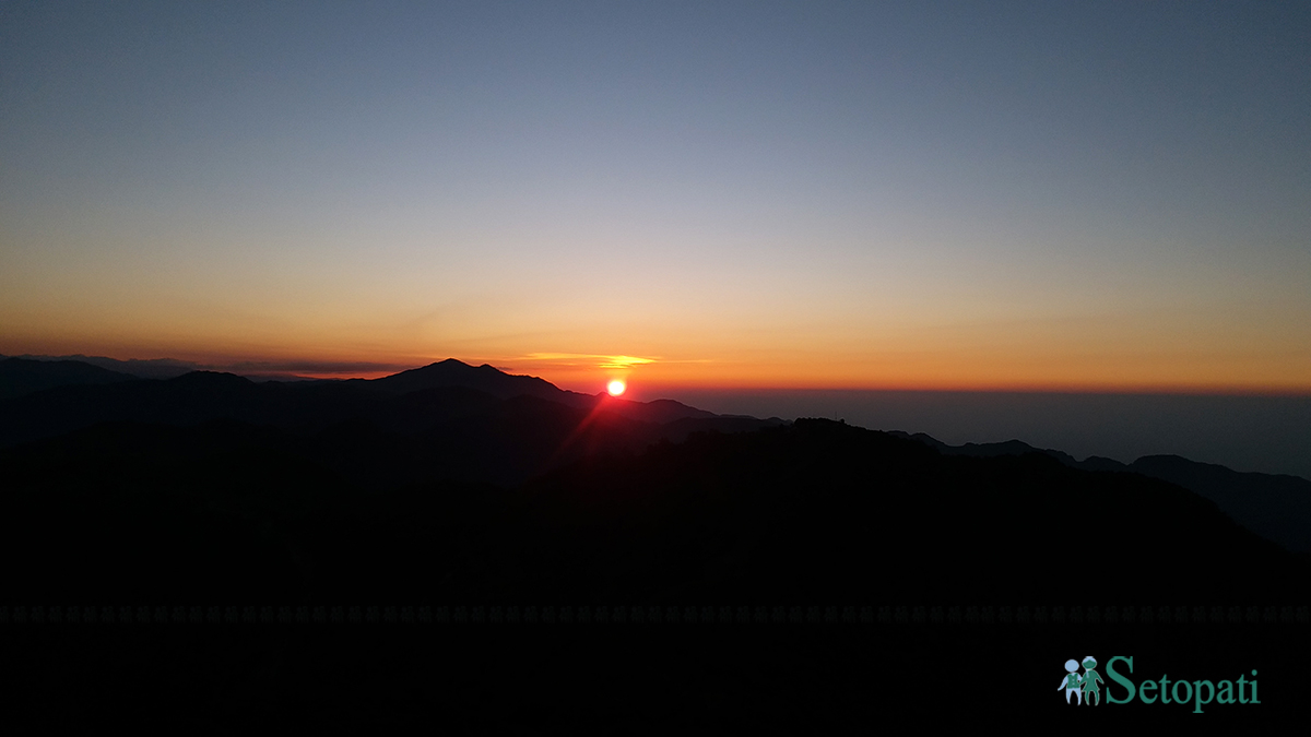 यति बेलासम्म हाम्रो वरिपरि निष्पट अध्यारोनै थियो। पूर्वी क्षितिजमा भने थोरै लालिमा देखिन थाल्यो। क्षितिजको लालिमा धर्सोका रूपमा विकास हुन थाल्यो। अब हाम्रा आँखा सूर्यको प्रतिक्षामा पूर्वतर्फ सोझिन लागे। यस बेलासम्म फाट्टफुट्ट मानिसहरू पनि आउन थाले। डाँडामा हामी सबैभन्दा पहिले पुगेका थियौं। आफ्नो वरिपरि अध्यारो थियो। मान्छेको अनुहार चिन्न सकिन्नथ्यो। तर, आवाज सुनिन्थ्यो। र, मानवाकृति ठम्याउन सकिन्थ्यो।