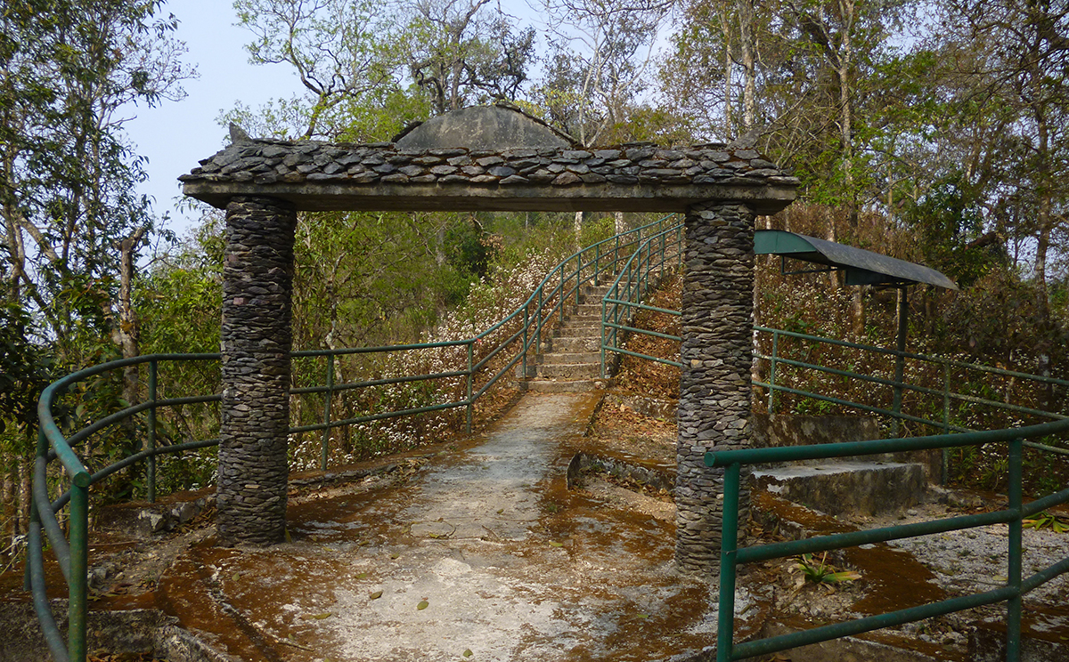 खोलापारि उकालो बाटो। अप्ठ्यारो त होइन, तर उचाइ लिइरहेको। सुकेका पातहरूमाथि हामी हिँडेको आवाज चराहरूको मीठा आवाजसँग मिसिएर एउटा सिम्फोनी बनेजस्तै लागिरहेको थियो। होंचा भए पनि बाक्ला रूखहरू थिए। कतैकतै राता फूलहरू मात्रै बोकेर उभिएका थिए अग्ला सिमल र फलेदोका रूखहरू।