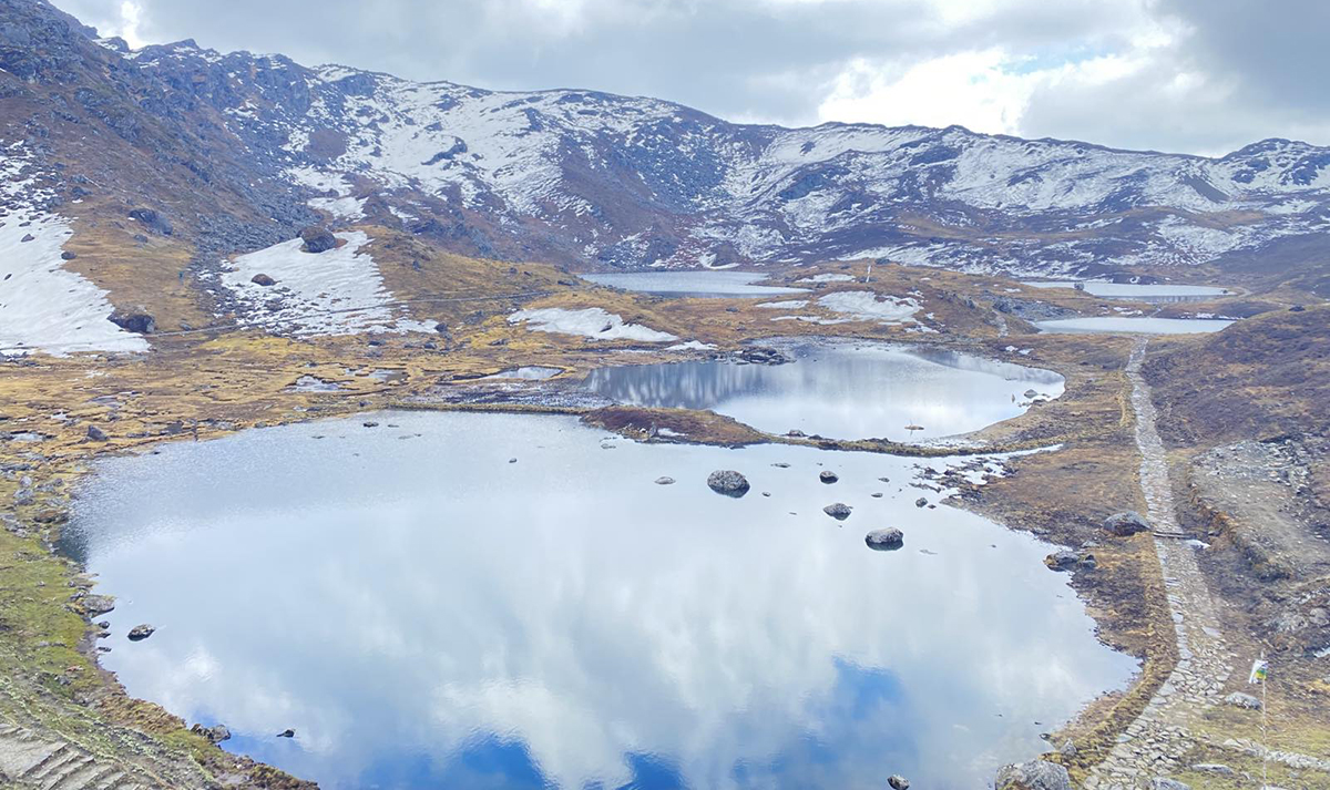 कञ्चन पारदर्शी पाँच वटा ताल वरिपरि आँखै लोभ्याउने हिमशृङ्खला ढाक्दै लुकिरहेका बादलका श्रृंखला।
