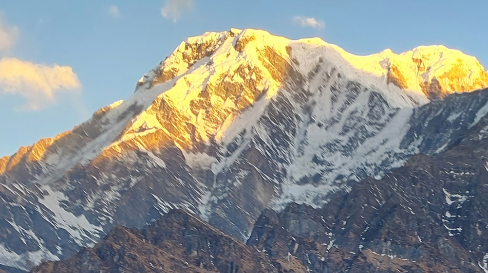 शनैः शनैः सूर्यको किरणसँगै जब उनको सुनौलो घुम्टी उघ्रिँदै गयो, मस्त जवानी रूपमा झैं उनी प्रकट हुँदै गइन्, पोखराको बिजी वि रेष्टुराँमा मदिराको नशामा, संगीतको धूनमा मस्त ती सुन्दरीहरूझैं। वरिपरि मादकता छरिरहिन्। फरक यति थियो उनीहरू आफ्नै धूनमा मस्त थिए तर उनी चाहिँ मलाई नै एकटक लगाएर नियालिरहेझैं थिइन्। म आफ्नो जीवनकै अविस्मरणीय क्षणको अनुभूति गरिरहेको छु।