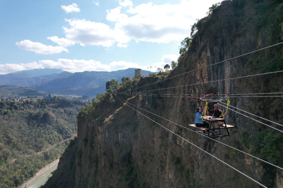 ‘बन्जीसहितका अन्य साहसिक खेलका लागि पर्वतको द क्लिफ पर्यायवाची भइसकेको छ, हामी सकेसम्मका फरक तर एड्भेन्चर खालका खेल तथा पूर्वाधारको निर्माणमा जुटिरहेका छौं, स्काई क्याफे पनि यही अवधारणामा तयार भएको हो’, कार्कीले भने, ‘तारमा झुन्डिएर हिँडिरहेको क्याफेमा बसेर खाजा खानुको मजा बेग्लै छ।’