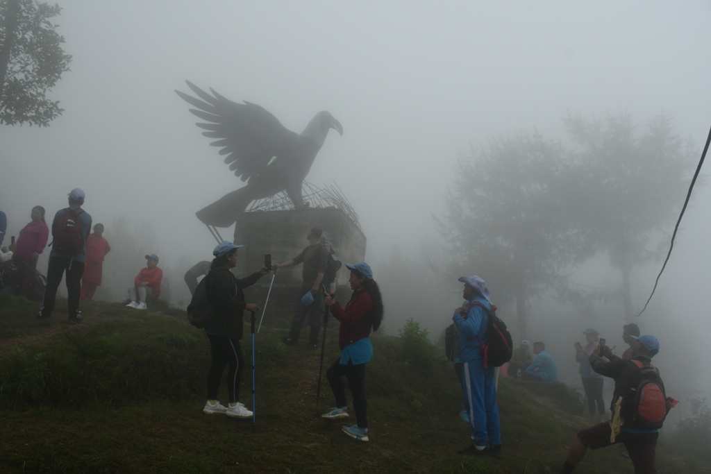 पदयात्राको शुभारम्भमै सिमसिम पानी परेको थियो। हाइकर्सहरूले छाता ओढेर हिँड्दा वातावरण रंगीन बन्यो। उद्यानमा पुगेपछि त भुइँकुहिरोले कागको प्रतिमालाई बेलाबेलामा ढपक्कै ढाक्थ्यो। हाइकर्सका मुहार चिसो बनाउँथ्यो।