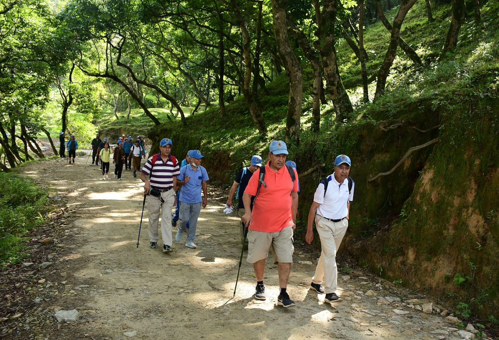 ‘आफ्नो स्वास्थ्य आफ्नै हातमा’ लेखिएको निलो क्याप लगाएका हाइकर्सहरूले झ्याउँकिरीको संगीत सुन्दै पदयात्रा गरेका थिए।