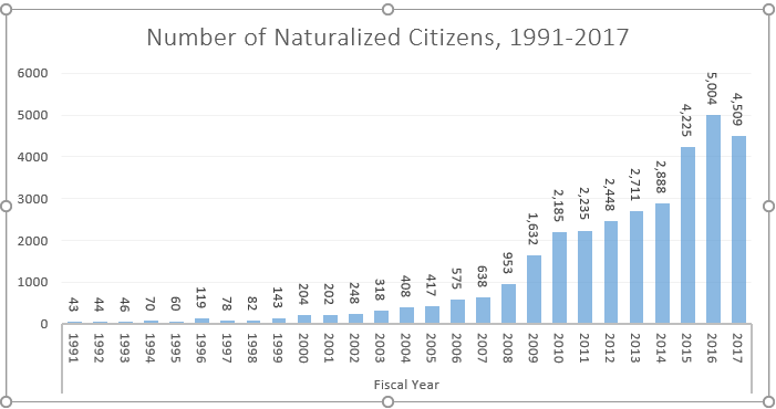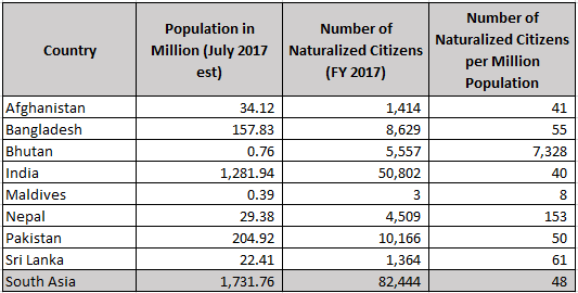 आर्थिक वर्ष २०१७ मा दक्षिण एसियाली राष्ट्रमध्ये सबैभन्दा बढी क्रमशः भारतबाट ५०,८०२ जना, पाकिस्तानबाट १०,१६६ जना, बङ्गलादेशबाट ८,६२९ जना, भुटानबाट ५,५५७ जना र नेपालबाट ४,५०९ जनाले अमेरिकाको नागरिकता लिएको देखिन्छ।