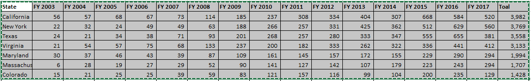 विगत १५ वर्ष (FY २००३- FY २०१७)को तथ्याङ्कको अध्ययन गर्दा सबभन्दा बढी नेपालीले अमेरिकाको नागरिकता लिएको राज्यहरूमा क्रमशः क्यालिफोर्निया (३,९८२), न्यूयोर्क (३,७६९), टेक्सस (३,५५८), भर्जिनिया (३,१३३) र मेरील्याण्ड (१,९९४) छन्। त्यस पछि धेरै नेपालीले अमेरिकन नागरिकता लिएका राज्य मा माशाचुटेश रकोलोराडो पर्छन्।