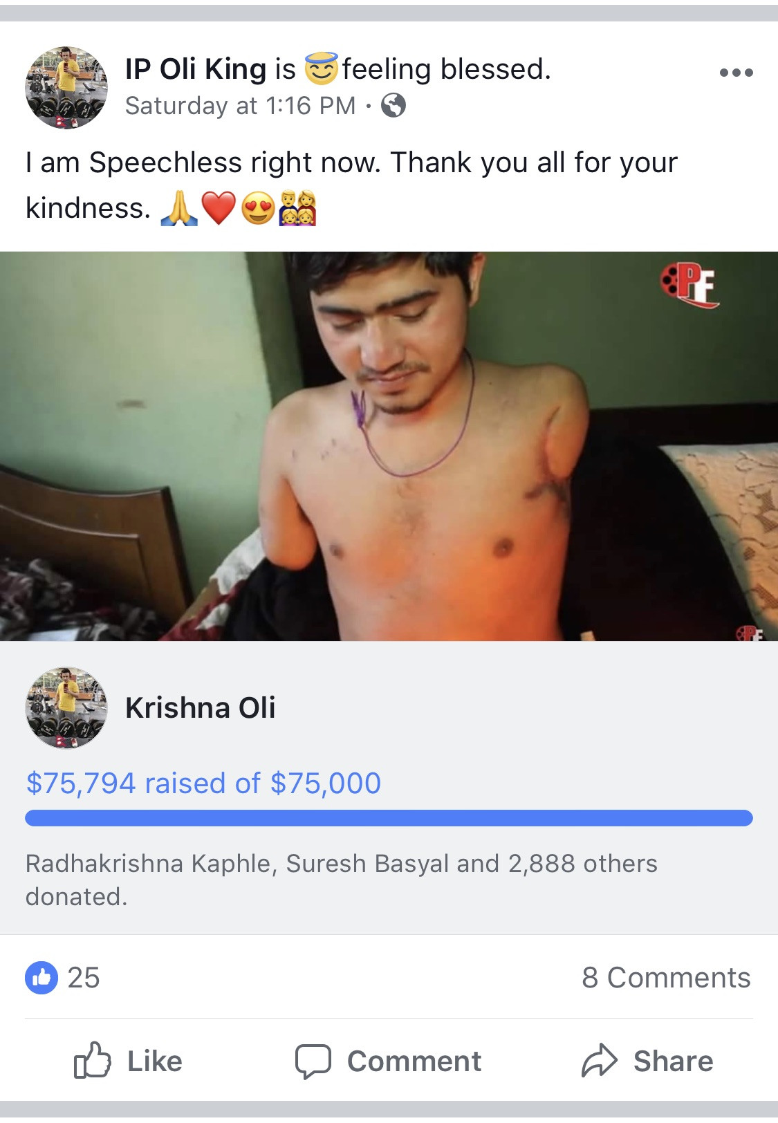 दाङ, तुलसीपुरस्थि विद्युत प्राविधिक पदमा कार्यरत कृष्णले विद्युत लाइन बिस्तार गर्ने क्रममा आफ्ना दुवै हात र खुट्टा गुमाएको कारुणिक कथा सुनेर सहयोगको झोली 'गो फण्ड' मार्फत फैलाईरहदा इन्द्रले सोचेका पनि थिएनन् कि यति ठूलो मात्रामा सहयोग जुट्छ।