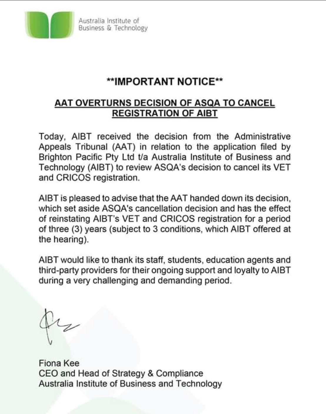 गत फेब्रुअरी महिनाको १९ तारिख आस्क्वाले एआइबिटी खारेज गर्ने निर्णय गरेको थियो। माथिल्लो निकाय एडमिनिस्ट्रेसन अपिल ट्रिब्युनल (एएटी)ले एआइबिटीलाई केही आन्तरिक शर्तहरु सहित पुन सन्चालनको अनुमति दिएपछि धेरै नेपाली विद्यार्थीले राहतको सास फेरेका छन्।
