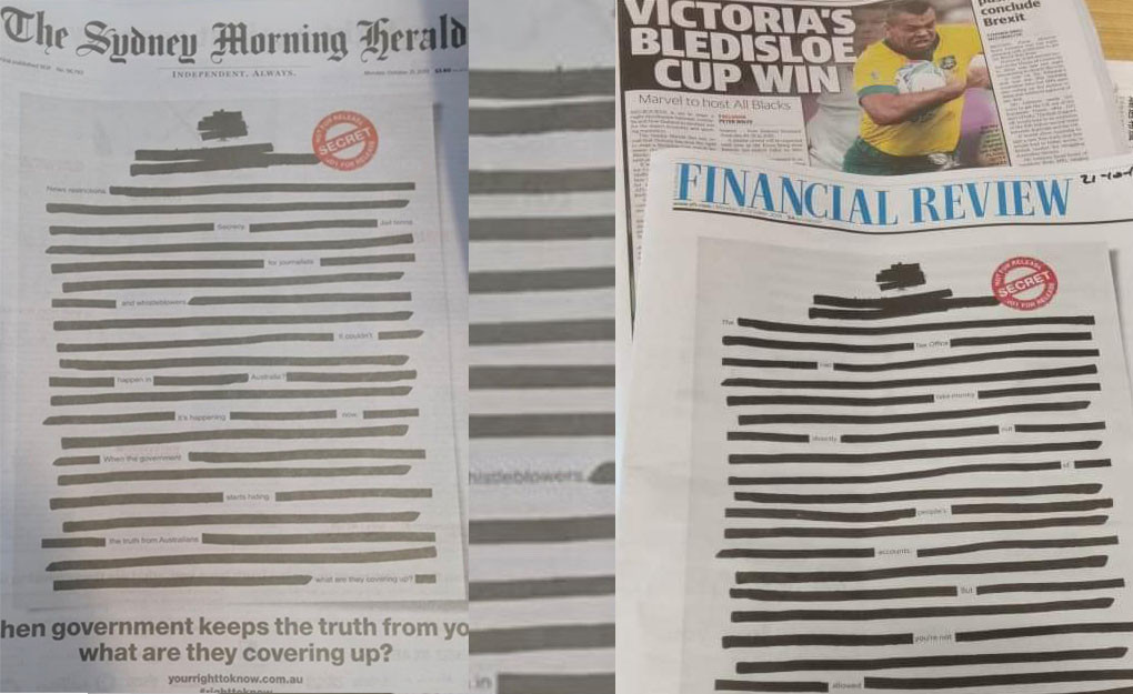 प्रेस स्वतन्त्रतामाथि सरकारले विस्तारै अंकुश लगाउने कानुन ल्याउन थालेपछि सरकारलाई दबाब दिन सोमबार अस्ट्रेलियाभरका प्रमुख सञ्चार संस्थाहरूले आ-आफ्नो पत्रिकाको पहिलो पृष्ठमा कालो पोतेका छन्।