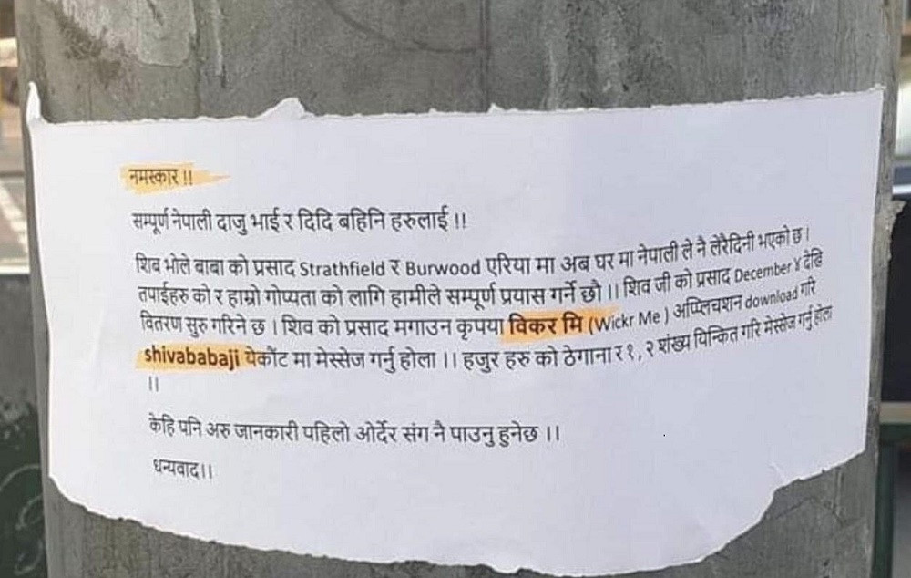 शिवजी प्रसाद र भोले बाबाको प्रसाद घरमै डेलिभरी गरिदिने सूचनाले फेरि यहाँको नेपाली समाजलाई तरंगित पारिदिएको छ। डिसेम्बरको पहिलो हप्ता पोलमा देखिएका केही पोष्टरमा लेखिएको छ, ‘भोले बाबाको प्रसाद घरमै डेलिभरी गरिनेछ, त्यसका लागि विकर मी एप्समार्फत अर्डर गर्न सकिनेछ।’