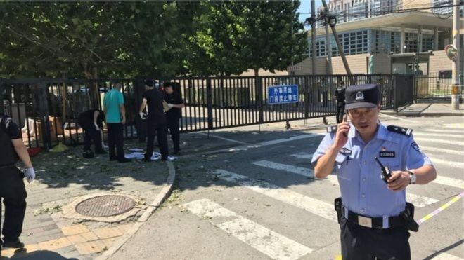 बेइजिङस्थित अमेरिकी राजदूतावास बाहिर एकजना २६ वर्षीय चिनियाँ नागरिकले आज अपराह्न बिस्फोटक पदार्थ पड्काएका छन्।
