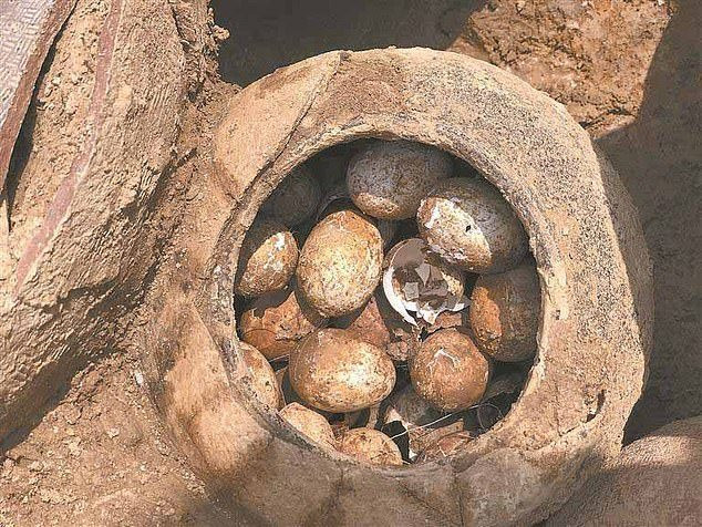 नानजिङ म्युजियम इन्स्टिच्यूट अफ आर्कियोलोजीका अनुसन्धाताहरुले लियाङ शहरको शाङसिङस्थित एउटा विशाल चिहानमा उत्खनन् गर्दा ढक्कन लगाइएको माटोको भाँडोमा ती अन्डा फेला परेको बताएका छन् ।