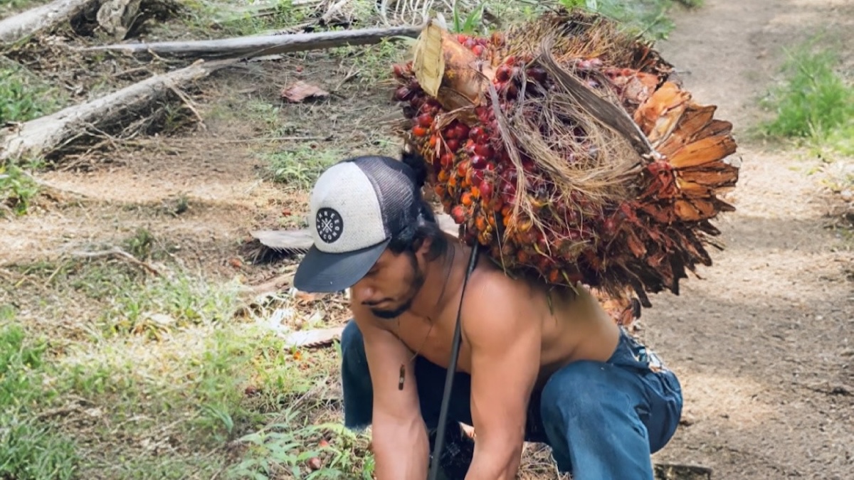 सुनिल काम गर्ने कम्पनीले ठूलो क्षेत्रफलमा पामखेती गरेको छ। उनी अग्ला रूखबाट फल काटेर एक ठाउँमा जम्मा गर्छन्। जम्मा गर्ने ठाउँ नजिकै भए पल्टाउँदै लैजाँदा पनि हुन्छ। टाढा छ भने ढाडमै बोक्नुपर्छ।