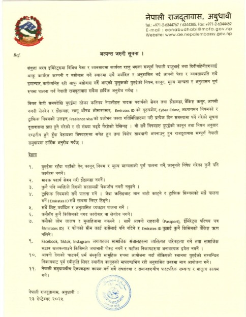 दूतावासले एक सूचना जारी गर्दै आफ्नो पेशा र व्यवसायप्रति इमान्दार, कर्तव्यनिष्ट रही आफू बसोबास गर्दै आएको मुलुकको युएईको नियम, कानुन, मूल्यमान्यता र अनुशासन पूर्णरूपमा पालना गर्न आग्रह गरेको हो।