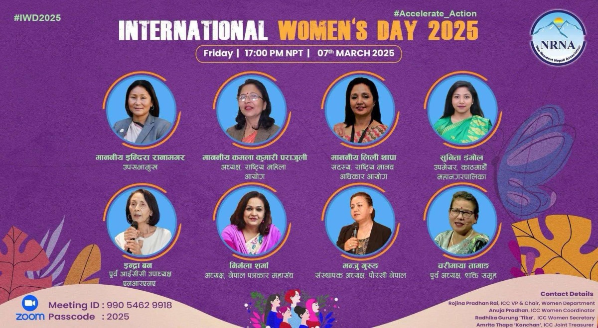 अन्तराष्ट्रिय महिला दिवसको अवसरमा गैरआवासीय नेपाली संघ (एनआरएनए) महिला विभागले विभिन्न क्षेत्रका महिलाहरूसँग अन्तर्क्रिया कार्यक्रम गर्ने भएको छ।