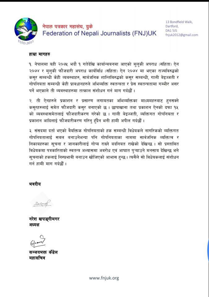 भदौ १ गतेदेखि लागू भएको नयाँ मुलुकी ऐनका केही व्यवस्था प्रेस तथा अभिव्यक्ति स्वतन्त्रता विरुद्ध रहेको भन्दै नेपाल पत्रकार महासंघ बेलायतले शाखाले संशोधनको माग गरेको छ ।