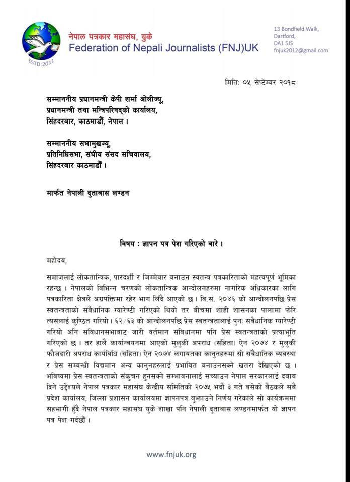 ज्ञापनपत्र बुझाउनुअघि महासचिव सञ्जयभक्त कंडेलले ज्ञापनपत्र वाचन गरेर सुनाएका थिए । ज्ञापनपत्र बुझाउन शाखाका वरिष्ठ उपाध्यक्ष अर्याल, महासचिव कंडेल, उपमहासचिव नरेन्द्र बस्नेत, संस्थापक सदस्य विपिन निरौला लगायतका पत्रकारहरुको टोली लण्डन दूतावास पुगेको थियो ।