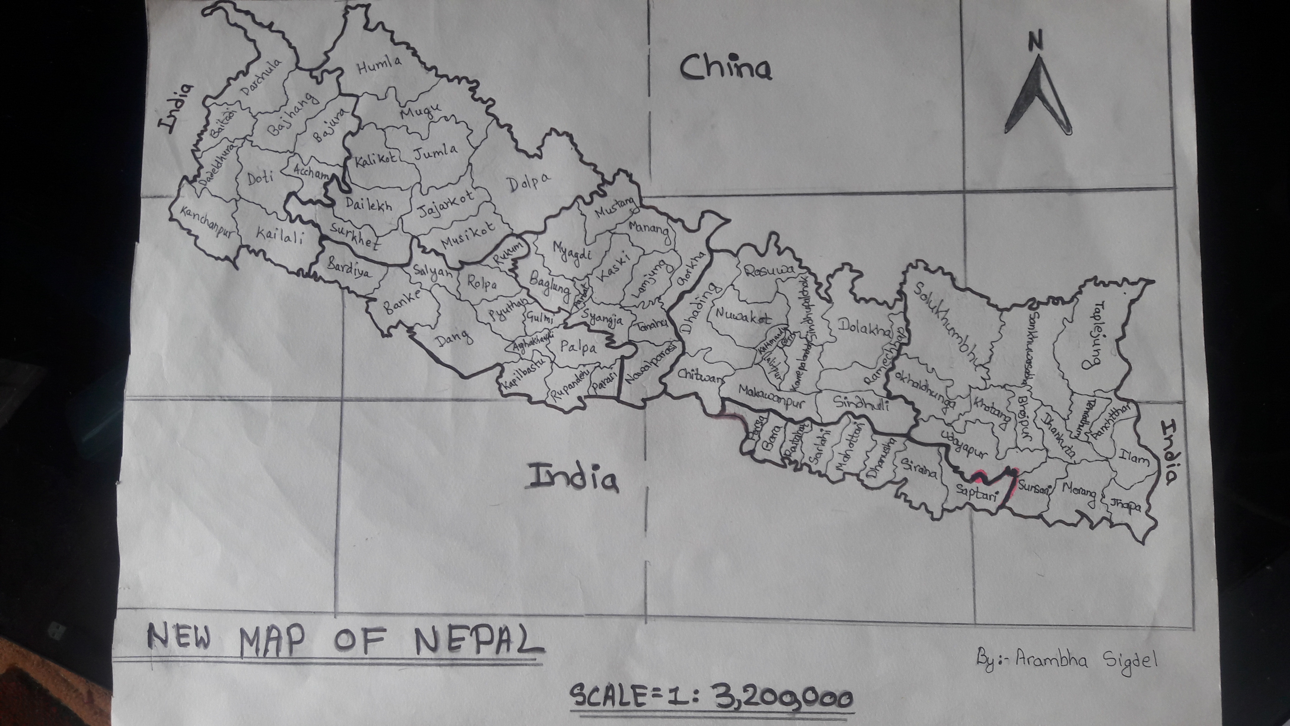 मैले नेपालको भर्खर छापिएको नयाँ नक्सा पनि बनाएको छु। साथीहरूलाई थाहा नै छ अहिले नेपालमा सातवटा प्रदेशहरू छन् अनि ७७ वटा जिल्लाहरू छन्। मैले नक्सामा प्रदेश र जिल्लाहरू पनि देखाएको छु। अब नयाँ नक्सा आएपछि हाम्रो देशको क्षेत्रफल पनि बढ्छ रे। कति भन्ने चाहिँ केही दिनमा मात्र थाहा हुने रहेछ।