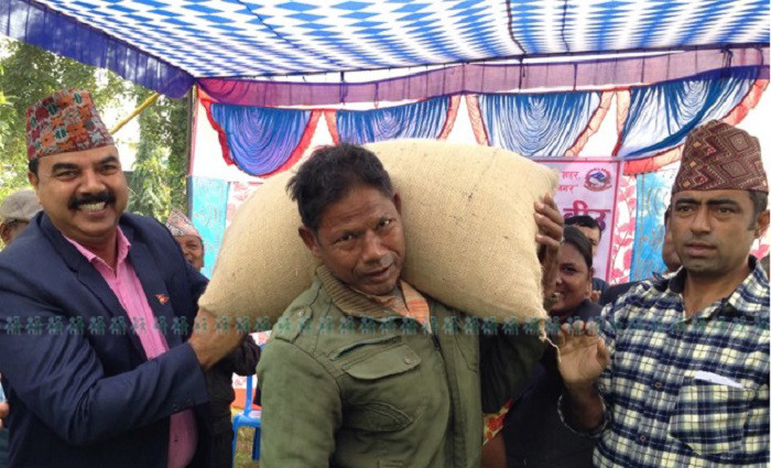 नगरप्रमुख घिमिरेले वडा नं. ११ मृगौलीका विश्राम कुँवर र रामलगन यादवलाई एक-एक बोरा बिऊ उपलब्ध गराएर कार्यक्रमको शुभारम्भ गर्दै बिऊको सदुपयोग गरी कृषि उत्पादन बढाउन किसानहरुलाई आग्रह गरे।